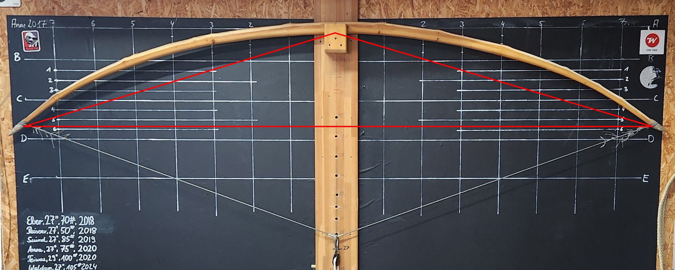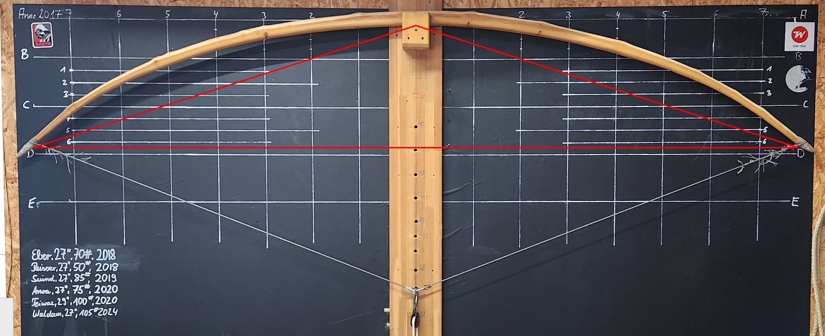 Etwas mehr Standhöhe knapp 4": Und 23" Auszug: @Schnabelkanne: Ich kann diesen langen Bogen nur mit Spannschnur am Tillerbaum spannen.... Quasi mit Umlenkrolle die Spannschnur ziehen damit ich die Sehen in die Nocke bringe... ist ein gutes Fitnessprogramm