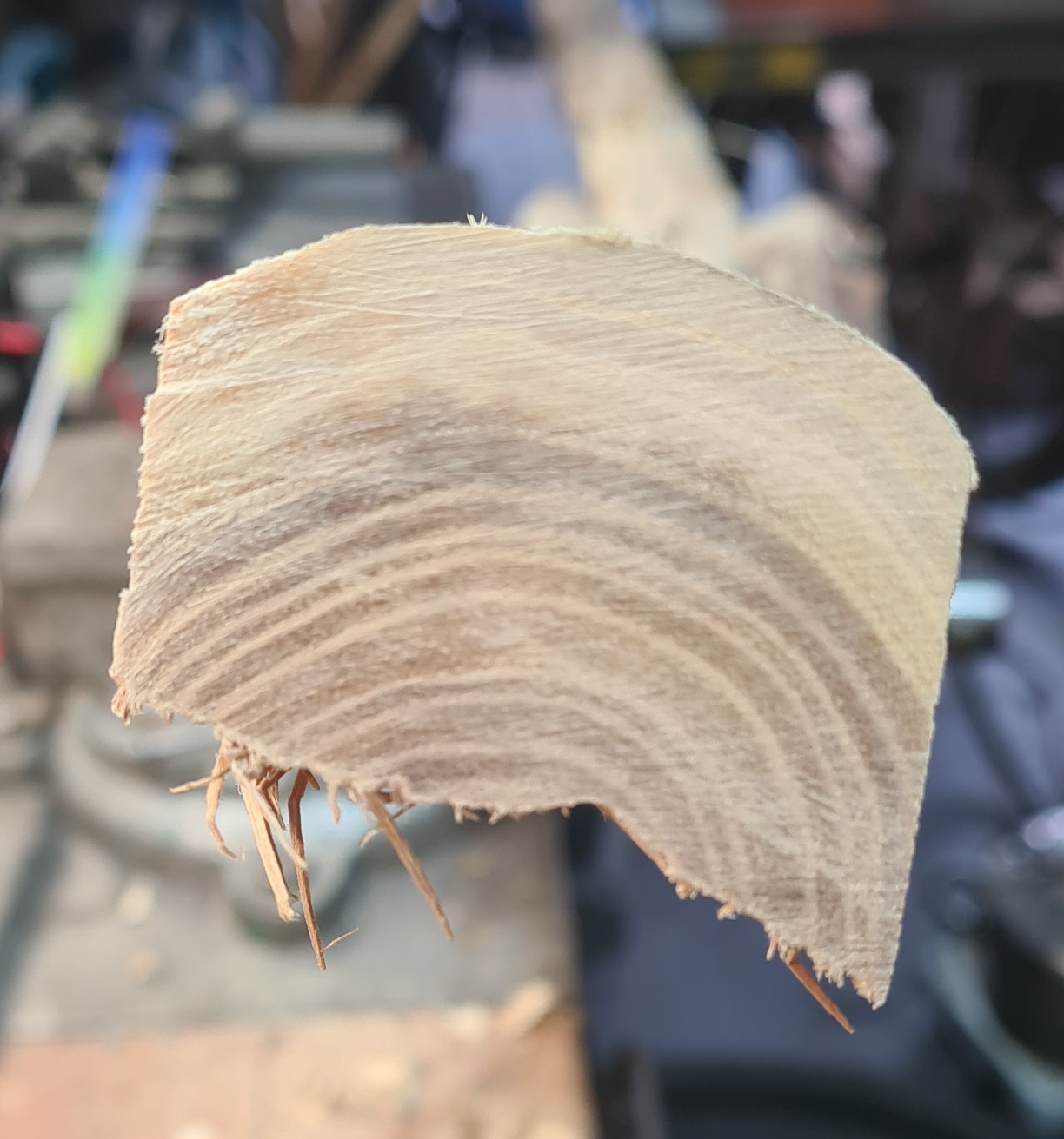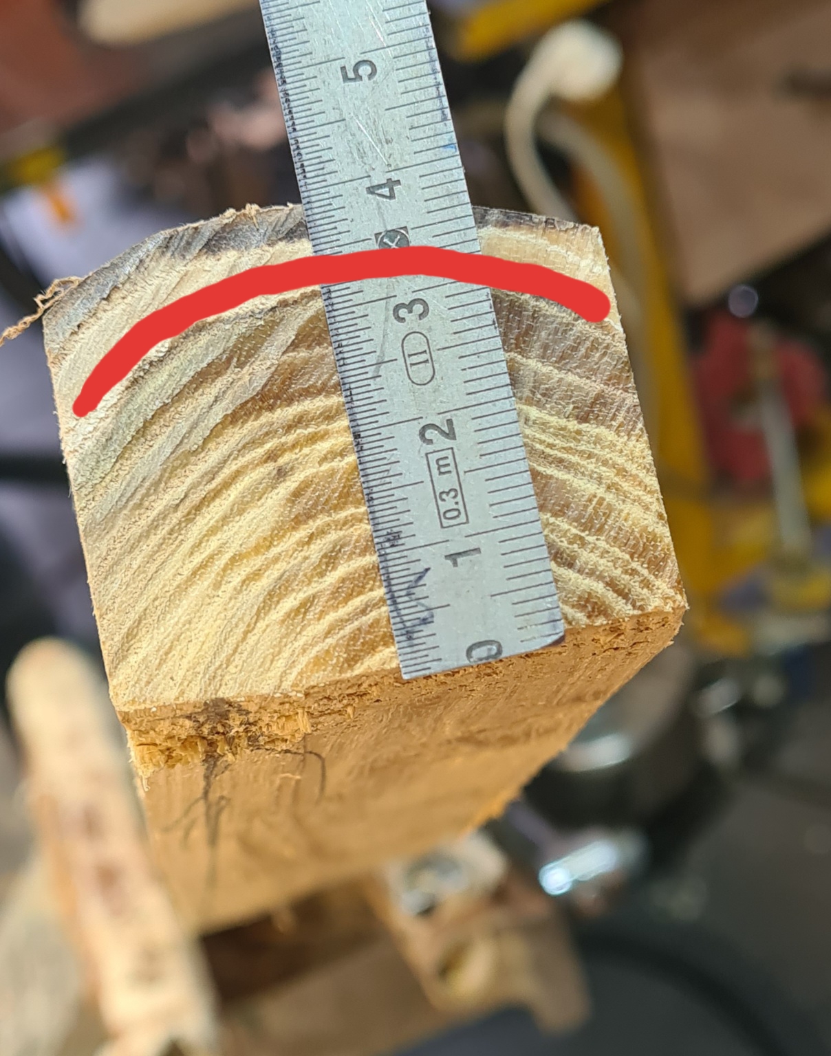 Ich bearbeite eine gespaltene Robinienhälfte mit viel ( ca 35°) Drehwuchs und einen satten Reflex. Nach durchlesen mehrerer Threads und aus eigenen Erleben möchte ich Splindholz stehen lassen. Viele meiner Robinienbogen sind bisher am Rücken gescheitert. Manchmal durch Verletzungen des Jahresring manchmal durch zu kleine Jahresringe. Diesmal habe ich ganz gutes Bogenholz aus dem Stabel ausgesucht.