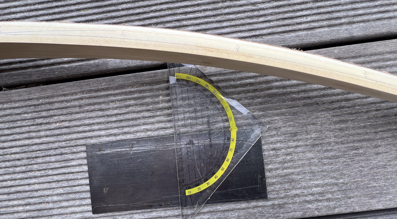 Heut habe ich seitlich mit dem Bleistift gerade Tillerlinien aufgezeichnet, dann den Bogen auf Standhöhe aufgespannt. Alle 7cm habe ich die Biegung der Tillerlinie gemessen. Kann man auch in kürzeren Abständen messen. Die Millimeter habe ich an der jeweiligen Stelle notiert. Damit können Steifigkeiten und Schwachstellen schnell und einfach detektiert werden. Gerade bei vielen deflexen und reflexen Wurfarmabschnitten hat man eine Möglichkeit der objektiven Beurteilung des Tillers. Als nächstes werden die markierten Stellen etwas geschwächt. Erst bei gleichmäßiger Biegung kommt der Bogen auf den Tillerbaum