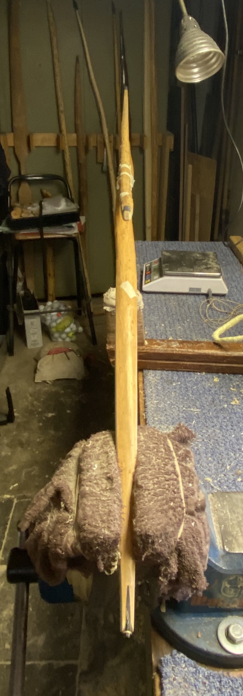 Das Konstrukt wiegt im Moment knapp unter 1000g. Zuggewicht kann ich noch nix zu sagen. Die Kirschpflaume ist bis 55@24" getillert (690g zur Zeit), aber das Holz ist viel "weicher" als ich das von meinen bisherigen Kirschpflaumen kenne. Nach dem tillern hatte ich 2" Stringfollow, der nach 2-3h wieder verschwindet. Ich fürchte, die ist noch viel zu feucht.