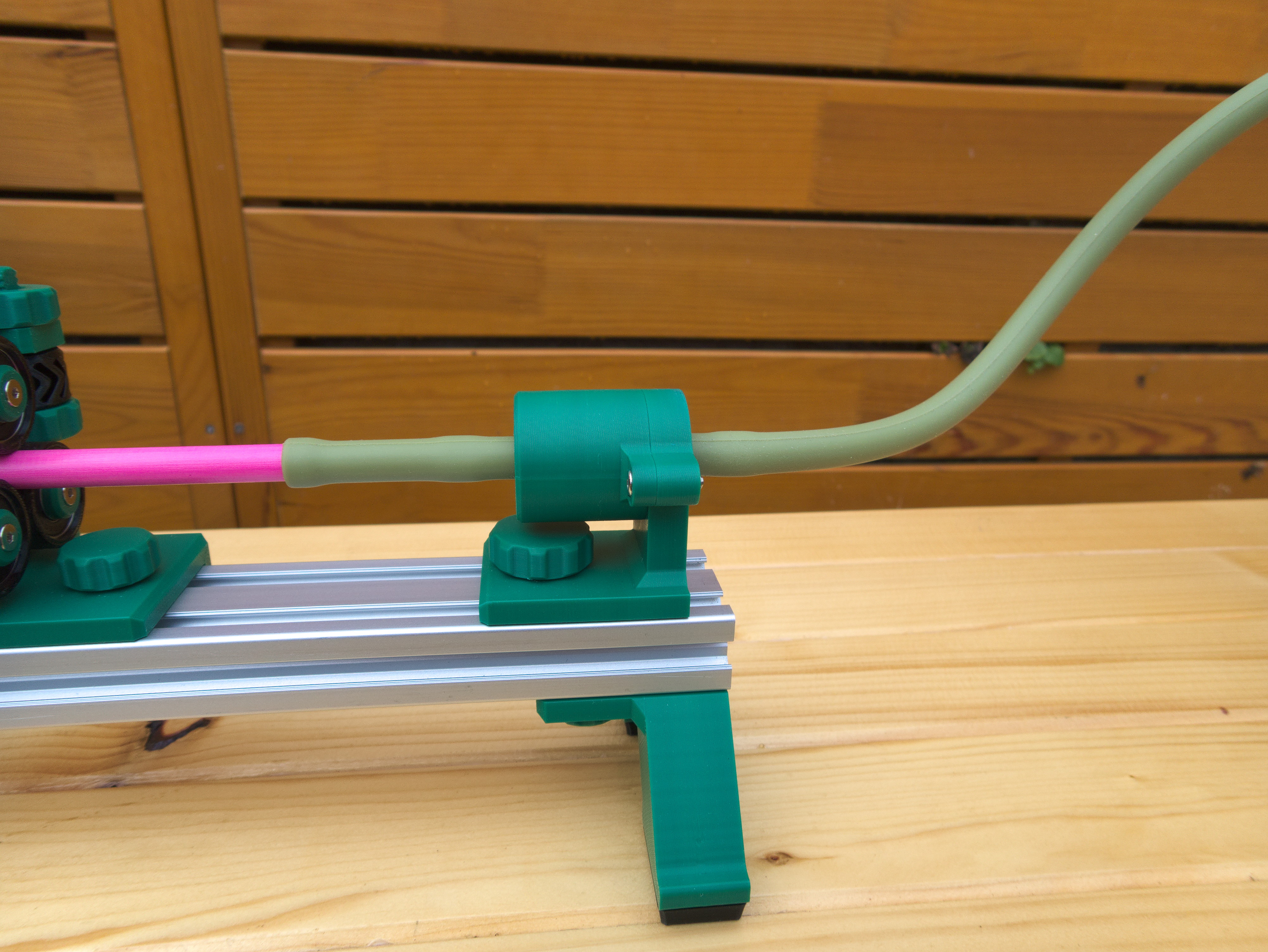 - Flexible Kraftübertragung mit fester Antriebswelle: Die Bohrmaschine ist über einen dicken Silikonschlauch mit der Welle verbunden, die in zwei Lagern läuft und den Pfeil dreht. So wird das Wackeln des Schlauchs nicht auf den Pfeil übertragen.