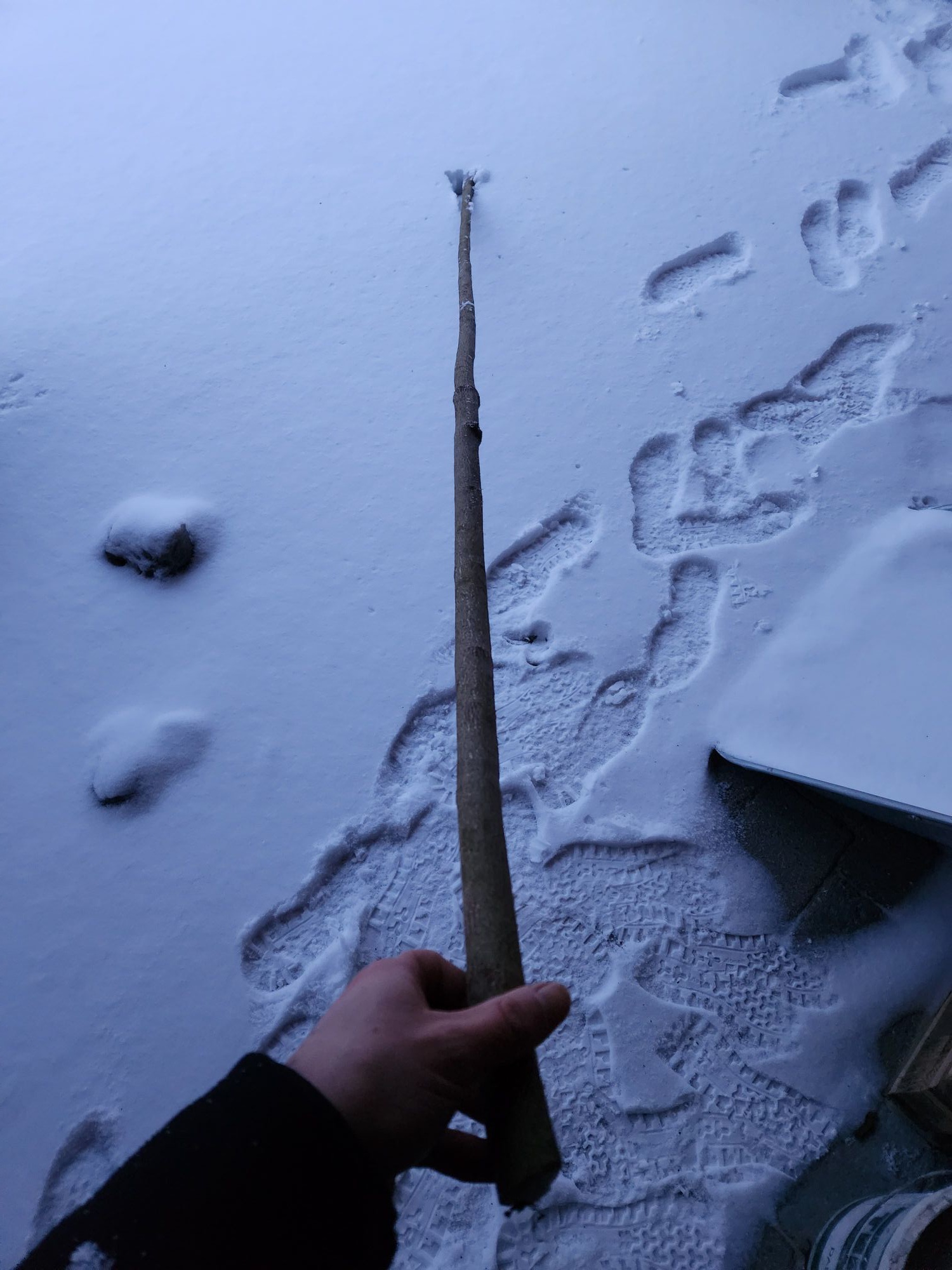 Gestern hab ich die beiden Rohlinge rein geholt weil das austretende Wasser an den Enden angefroren war und ich noch mit Leim versiegeln wollte. Hab dann aber drauf vergessen und erst heute Vormittag versiegelt. Bei dem dünnen hab ich das Ende mit dem Knick noch gekürzt. Nutzbare Länge wäre jetzt noch bei 185cm wenn ich den Knick mit einbau. Hab dann beide Rohlinge noch gewogen und wieder raus gelegt.