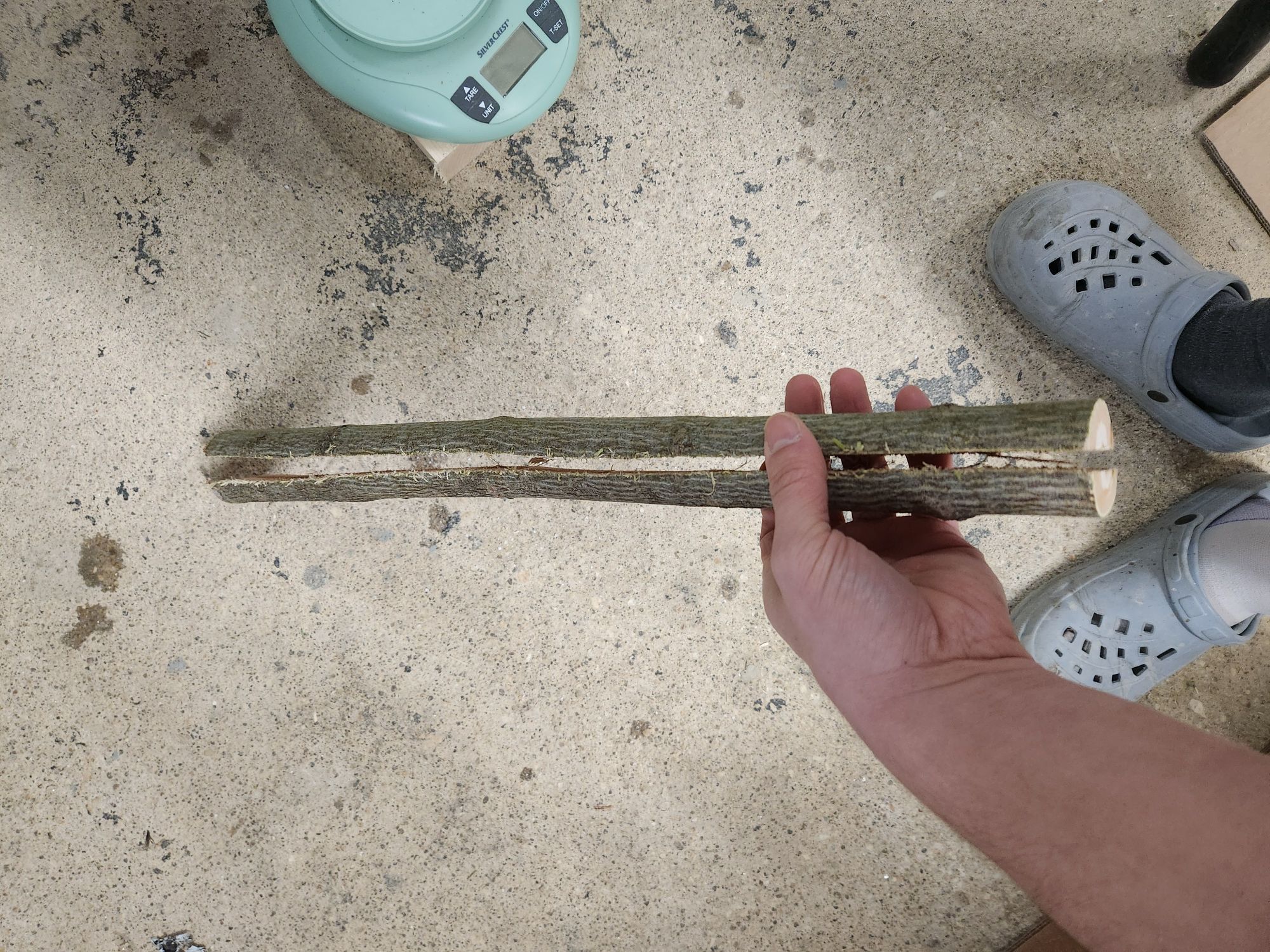 Ich hab mir den dickeren Stave jetzt nochmal angesehen. Der hat draußen in 4 Tagen nur 24g verloren, deshalb wandert der jetzt erstmal mit Rinde in die Garage. Bei dem seh ich im Moment nur 2 Möglichkeiten wie da ein Bogen drauß wird.