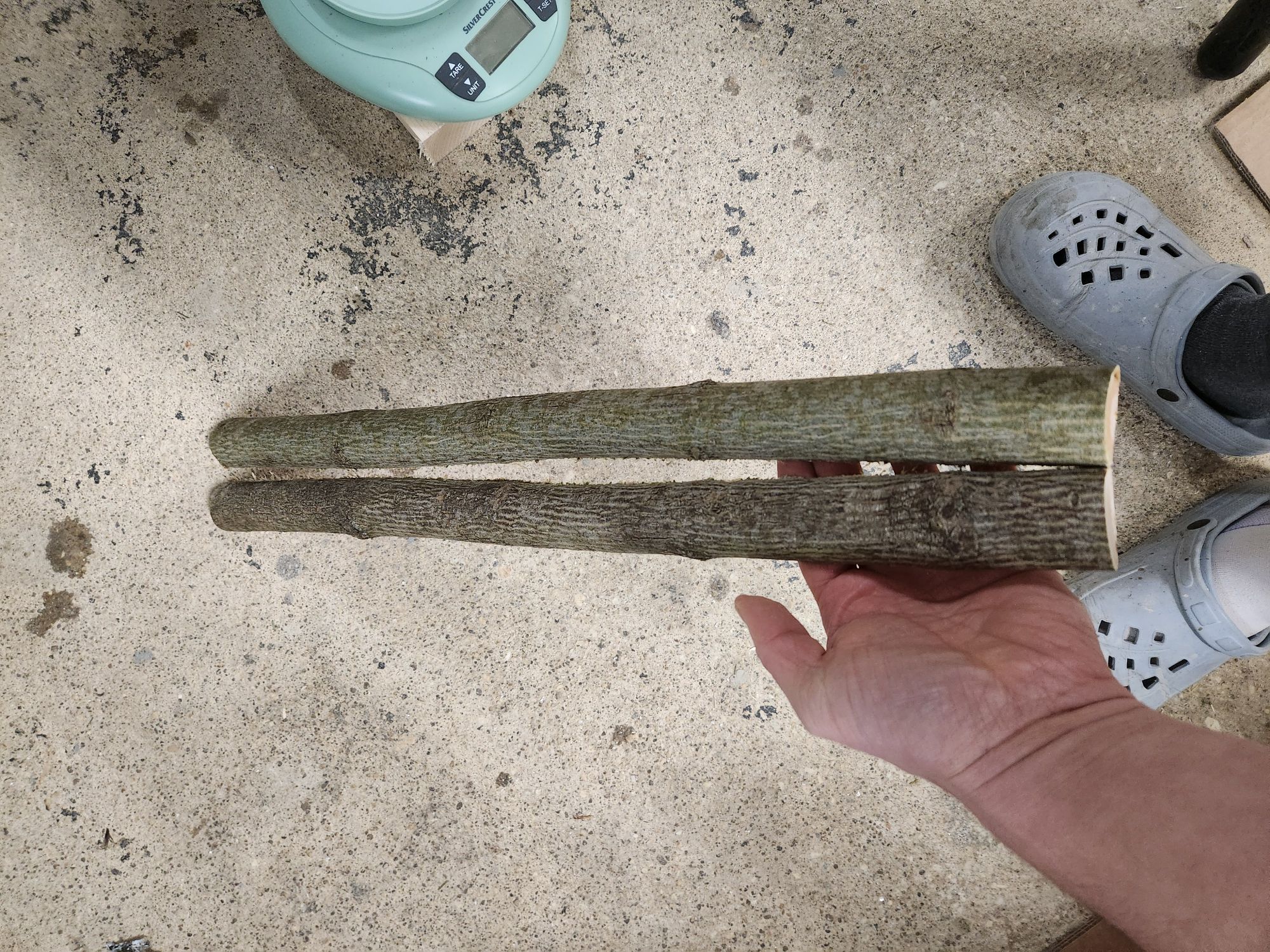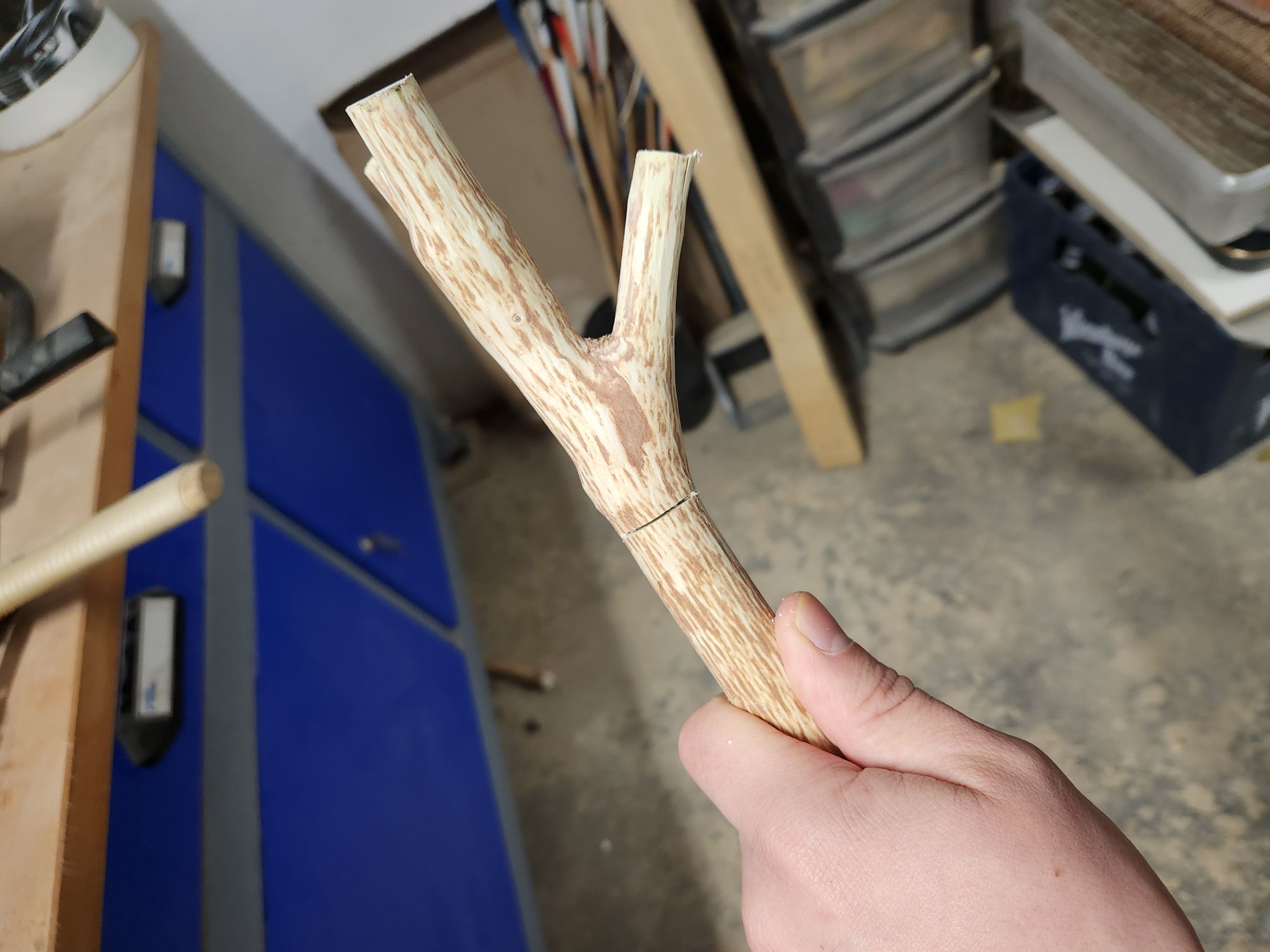 Zuerst hab ich das gerade Stück rausgeschnitten und mit der Bandsäge mittig geteilt. Dicke liegt jetzt wo bei 17mm. Entrindet sind se natürlich auch schon. Und für den Griffaufbau, und um auch den inneren Bereich der Wurfarme dicker zu machen hab ich aus dem Reststück auch noch den geraden Bereich rausgeschnitten und mittig geteilt. Diese Teile sind 60cm lang. Diese werd ich dann vll auch zusammen Spleißen um mehr vom Bogen abzudecken.