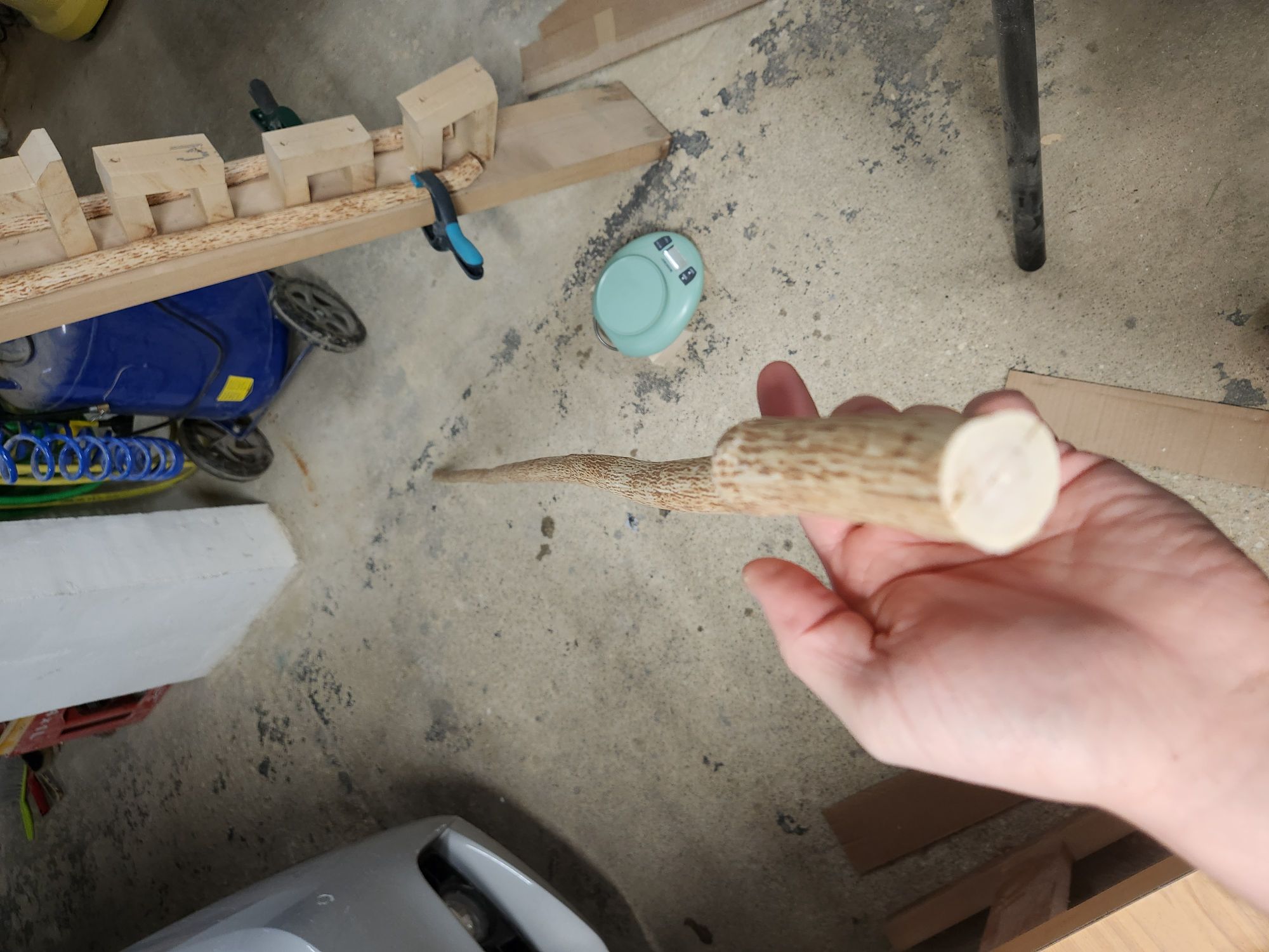 Der Dünne: Ich hab ihn an beiden Enden eingekürzt. Am geraden Ende hab ich die Gabelung entfernt und das Ende mit dem Versatz hab ich vor dem Ast abgeschnitten, den Versatz aber dran gelassen. Ein bisschen Charakter soll ihm doch auch bleiben. Jetzt hat er noch eine Länge von 1,7m.