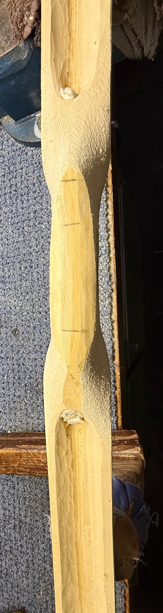 Ausserdem habe ich den Markkanal mit dem Rundeisen erweitert. Der Sapling hat einen so hohen Rücken, da werden mir die Wurfarme sonst zu schmal. Ich werde also Richtung HLD gehen. Ein HLD-Mölle also. Mal schauen. 1532g.