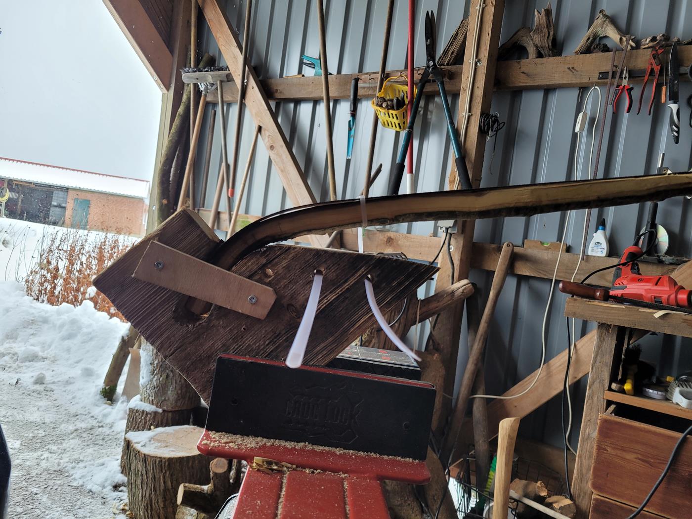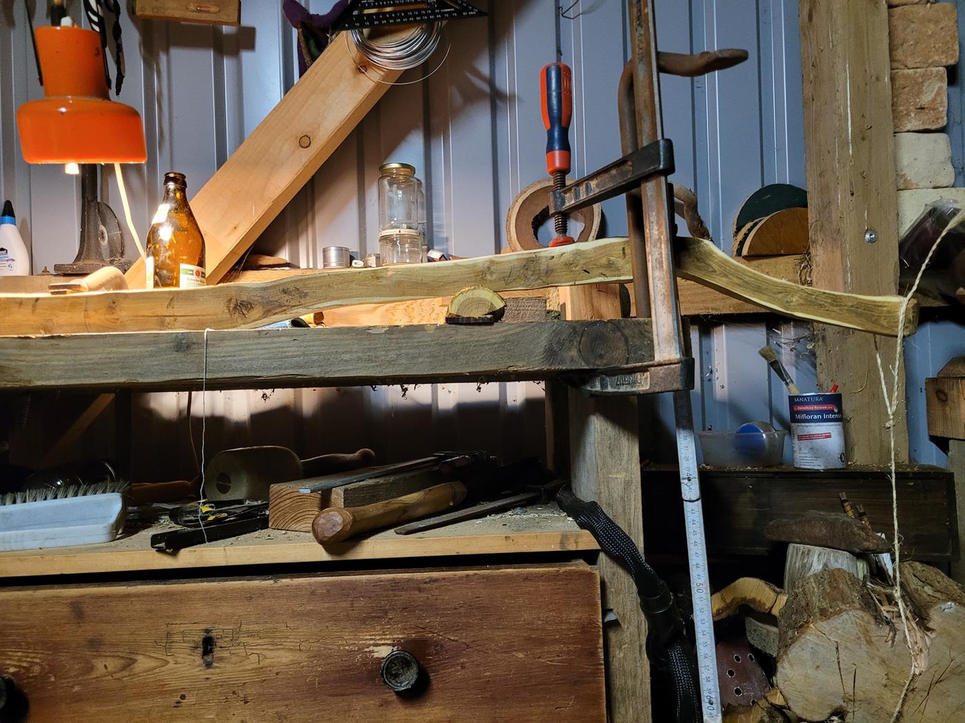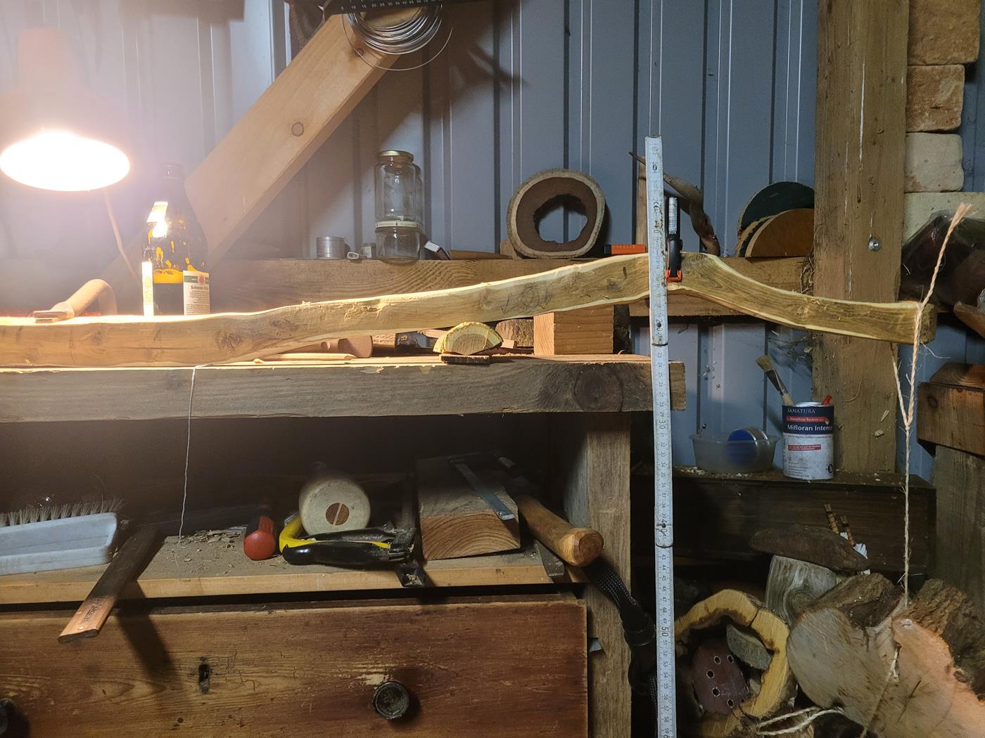 soweit ganz zufriedenstellend. Zwei kleinere Einrisse konnte ich wegschnitzen. Morgen werde ich versuchen den natürlichen Recurve nachzubilden. Dafür hatte ich heute schon zwischendrin eine Q&D Biegeform angefertigt.