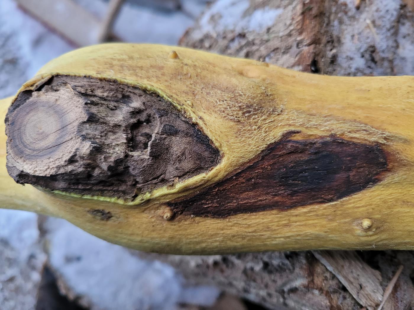Der Splint direkt unter dem Bast ist schön gelb. Hier im Kontrast zum Neuschnee
