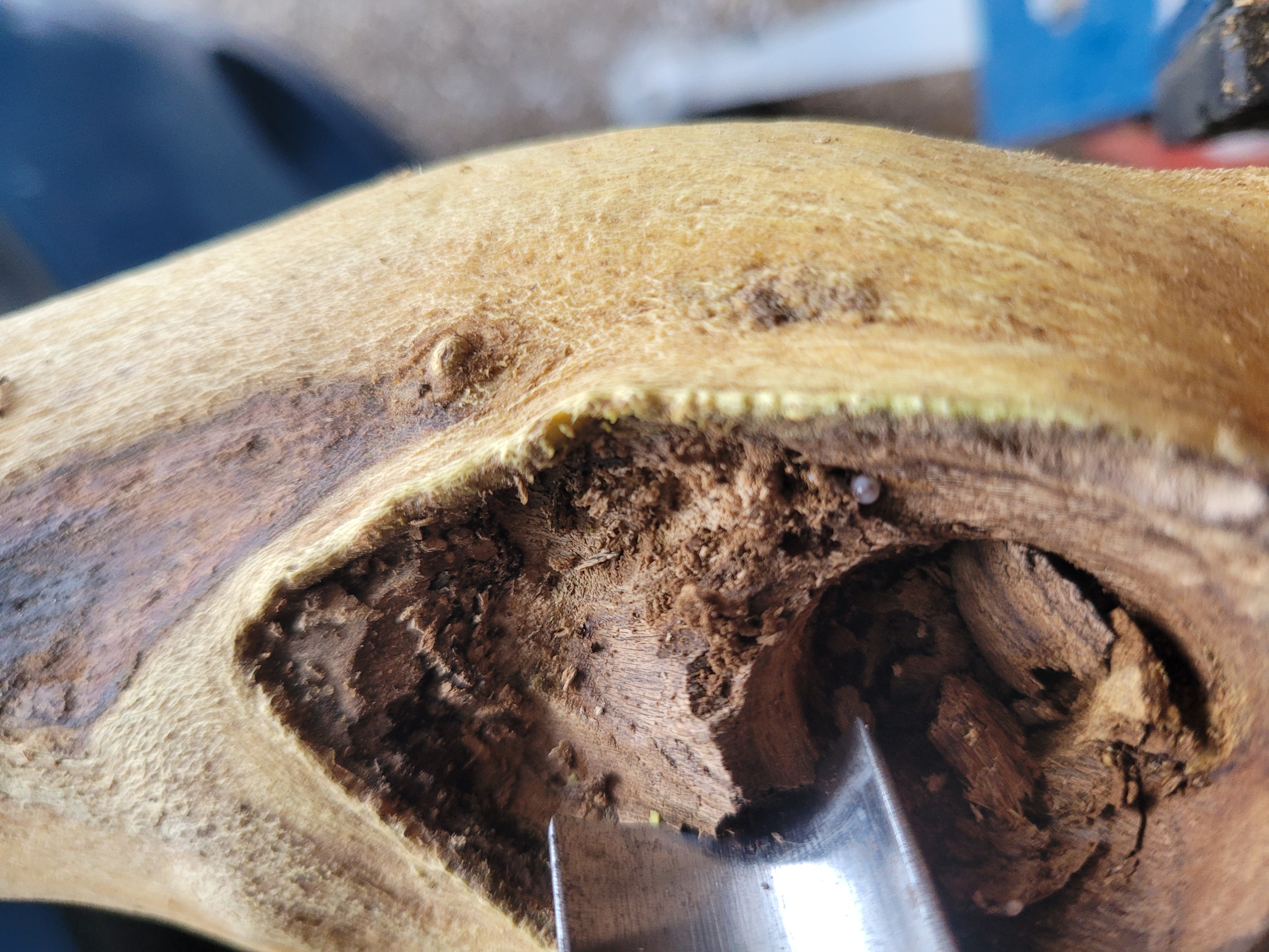 Zuerst den Ast herausgelöst, dann das schwarze und bröselige Zeugs raus. Hoffentlich bleibt genug stabiles Holz übrig!