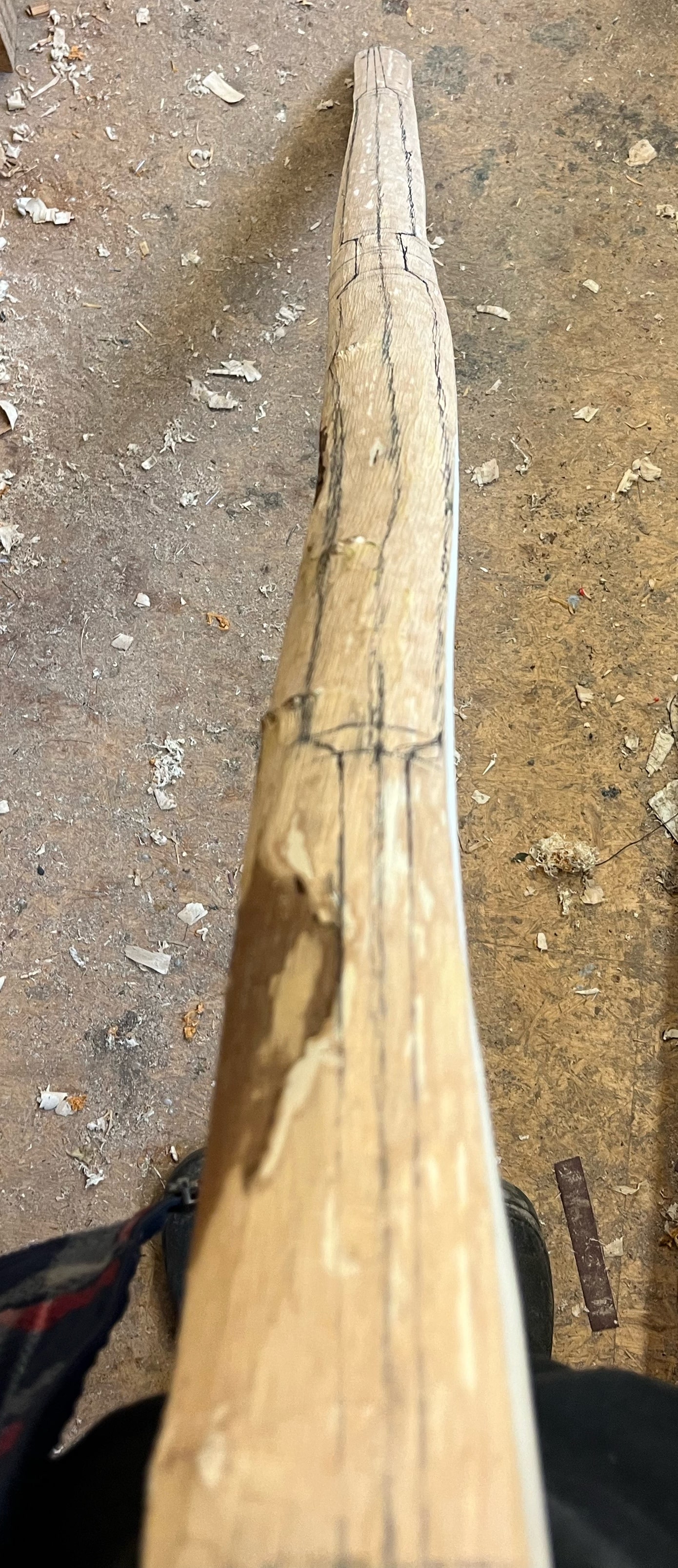 Dann mal grob ausgeschnitten, nun darf er wieder ein paar Tage trocknen, danach wird wieder Sehnenlage geoprüft und ein bisschen was, das nicht nach Bogen aussieht weggeschnitzt, usw.... ;)