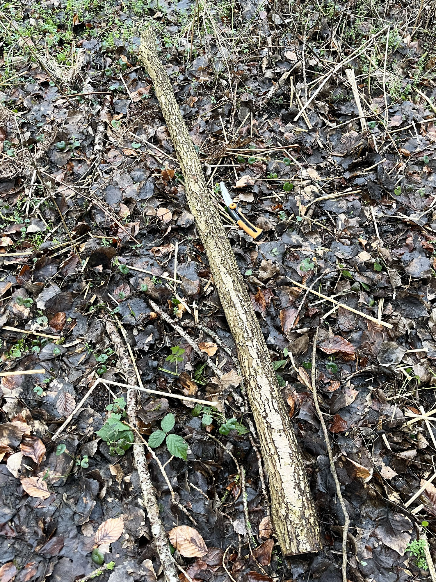 Der ist noch gut 2 Meter! Das Bild aus dem Wald schmeichelt dem guten Stück wahrscheinlich, so schön grade und astfrei ist er leider nicht. Ein großer Ast liegt etwas zu weit außerhalb der Mitte, das Ding ist untenrum ganz schön oval, mal sehen was sich noch offenbart. Ich zieh später mal die Pelle ab, dann wird das Bild klarer.