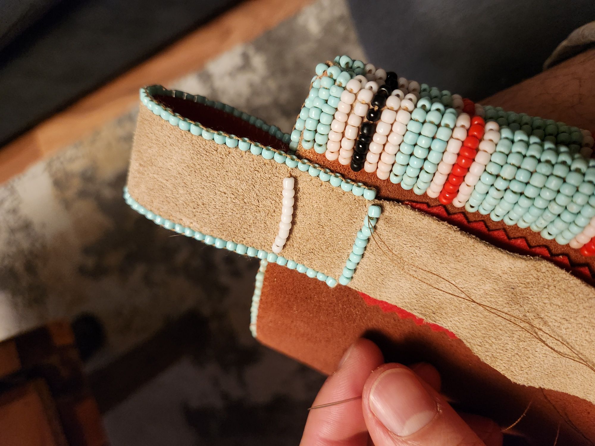 Der Köcher färbt jetzt nicht mehr ab und ich hab begonnen die Riemchen am Köcher zu befestigen. Zuerst mit Kleber auf Position fixiert, dann hab ich die weiße Perlenreihe befestigt, aber gleich alle am Stück ohne zwischenstiche. Wäre mir zu schwierig da beim durchstechen die richtige Position zu treffen. Deshalb hab ich dann für besseren halt unter der blauen Perlenreihe hin und her gestochen. Somit sieht man die Naht nicht.