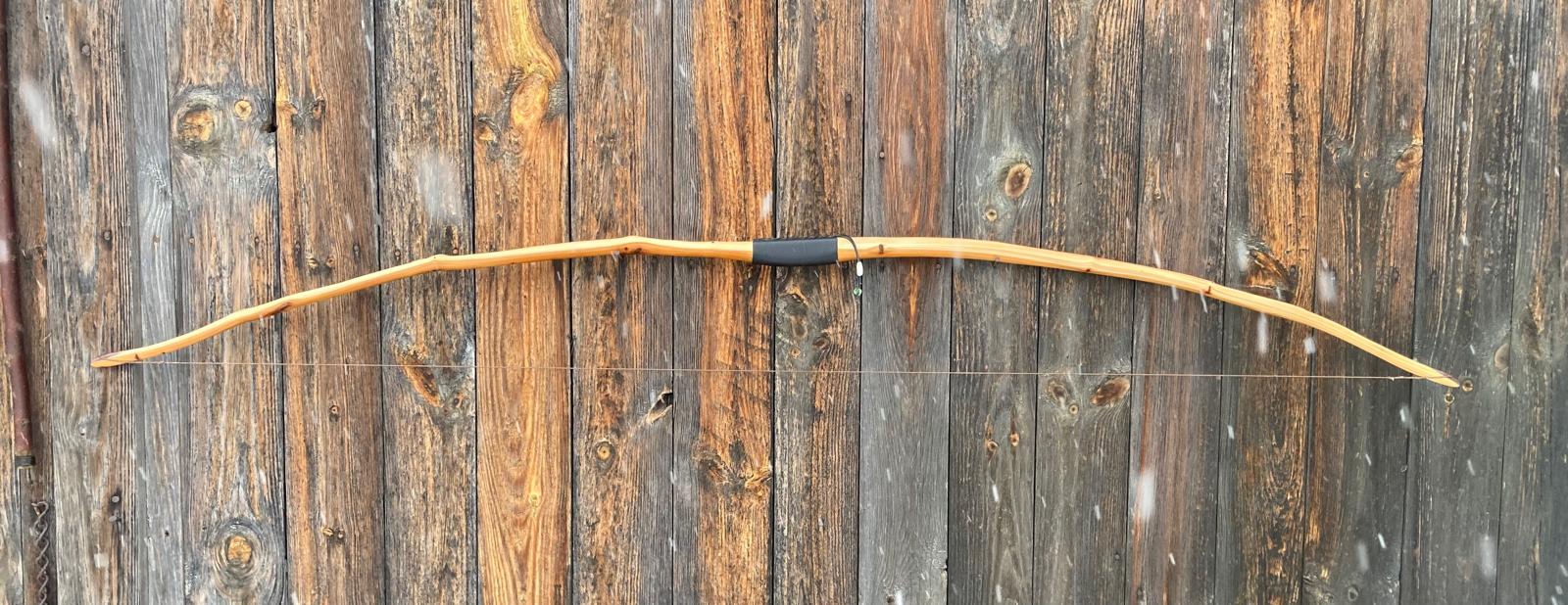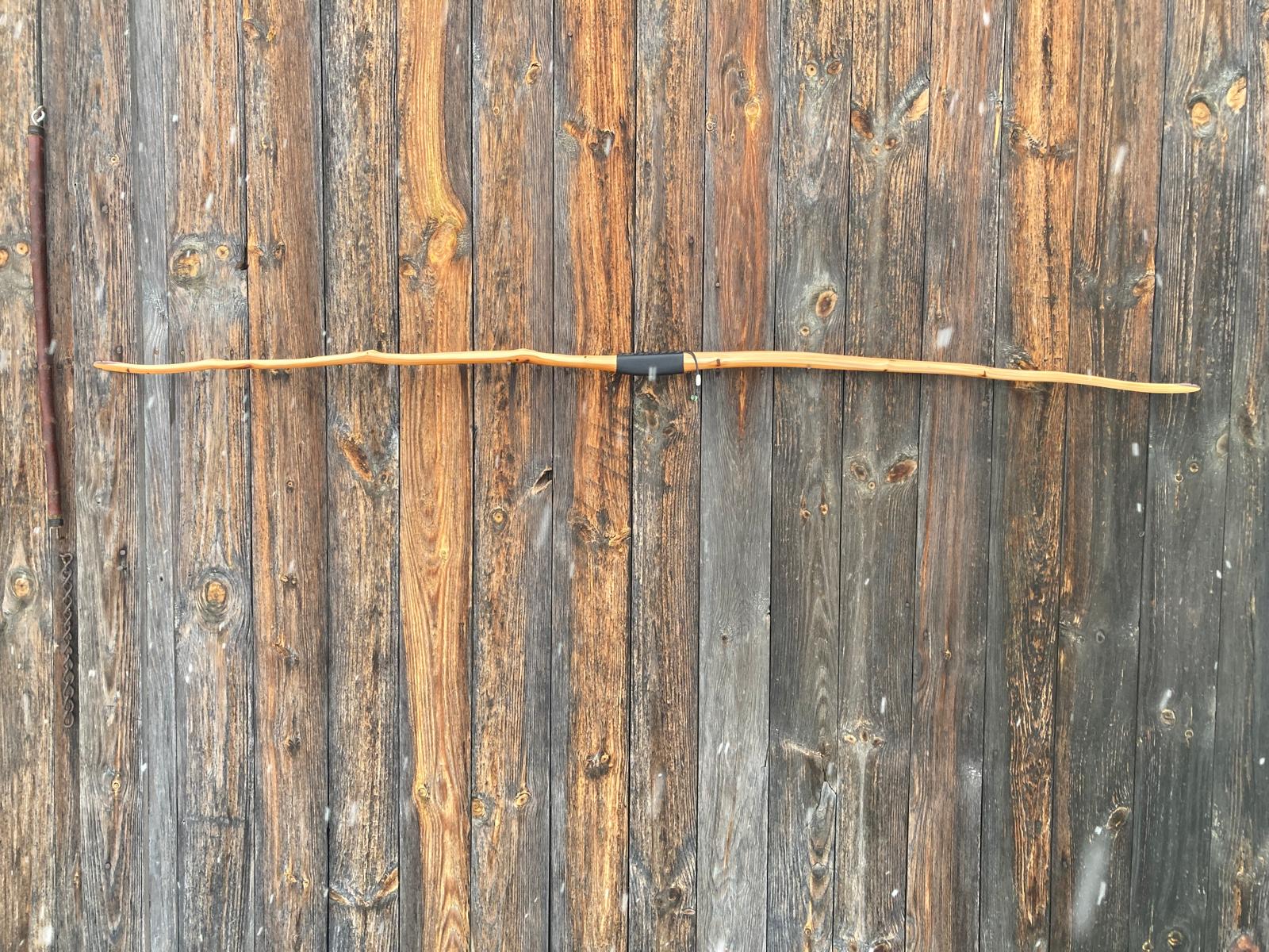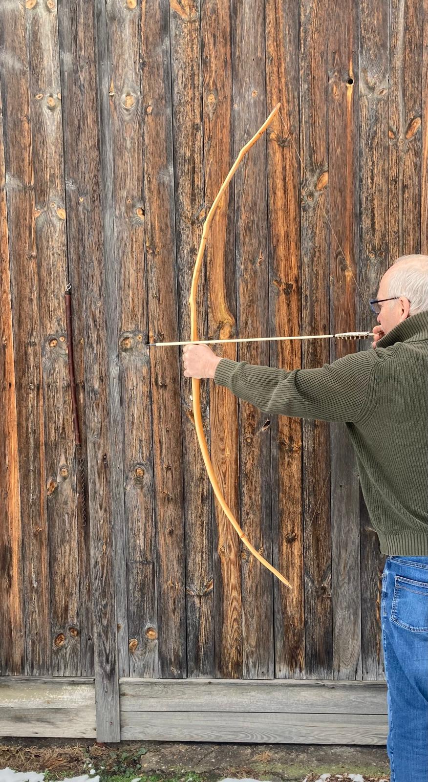 Der Bogen entstand aus einem 1 m langen Eibenstämmchen, das ich teilte und die beiden Billets im Griff verspleißte. Der Bogen sollte bei einer Länge von 170 cm ein Zuggewicht von 40-45 Pfund erreichen. Die Wurfarme hab ich auf gut 3 cm Breite und 2,5 cm Dicke ausgeschnitten,ohne auf Holz oder Jahresringe zu achten