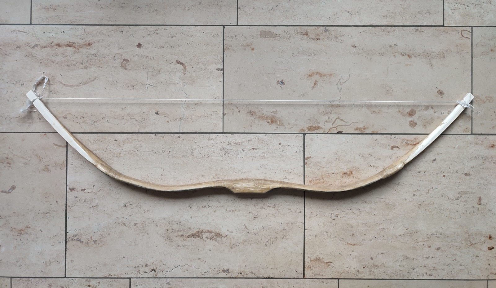 So,...heute kam die Letzte Schicht(1,5 Schichten) auf den Bogen. Vorher wurde der Bogen nochmal grundiert mit 10%tigem Hautleim. Jetzt hängt er mumifiziert im Wohnzimmer über der Heizung. Da darf er nun die nächsten 3Wochen trocknen. Er hat zur Zeit 15,5cm Reflex über dem Griff. Somit hat er in den zwei Tagen schon ganz schön zugelegt...