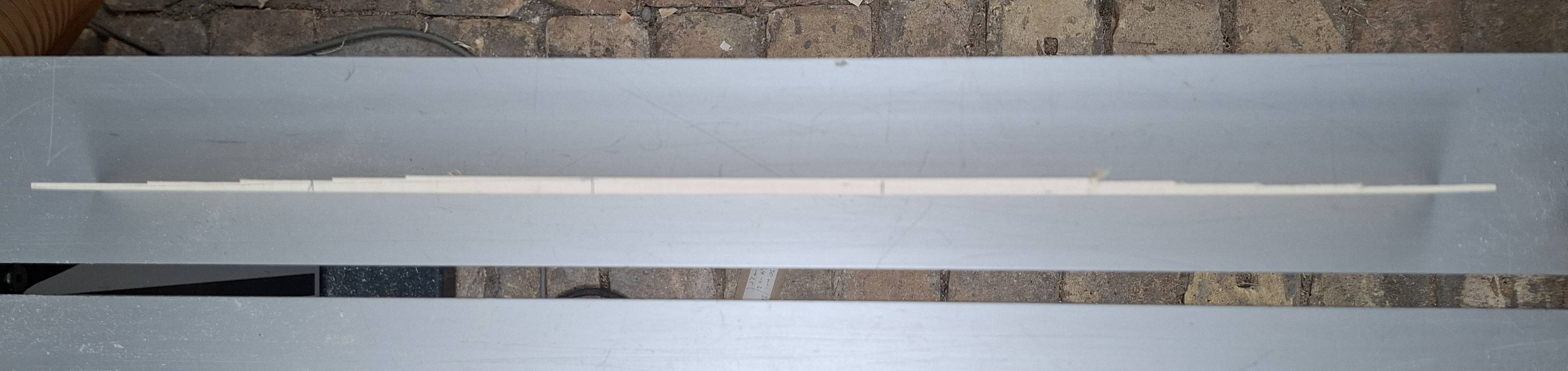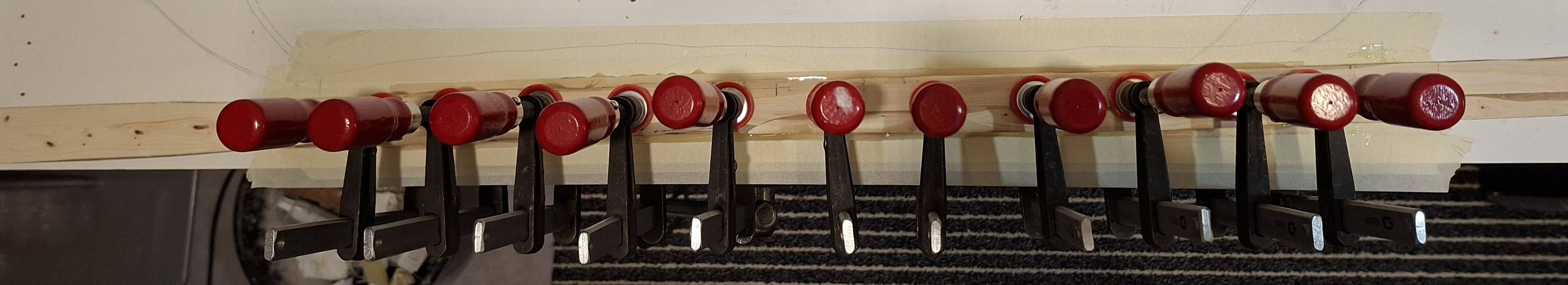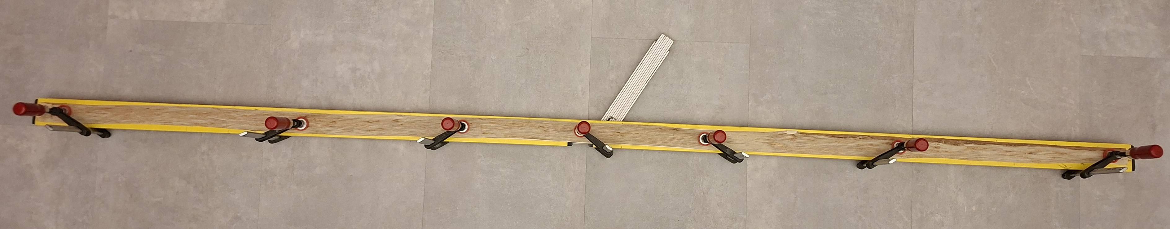 Heute Vormittag wurde die lange Stange nochmal gebogen und vorhin reduziert und geschliffen. Außerdem habe ich das Powerlam geklebt. Die zunächst als Rückenseite vorgesehene Seite wird jetzt die Bauchseite.