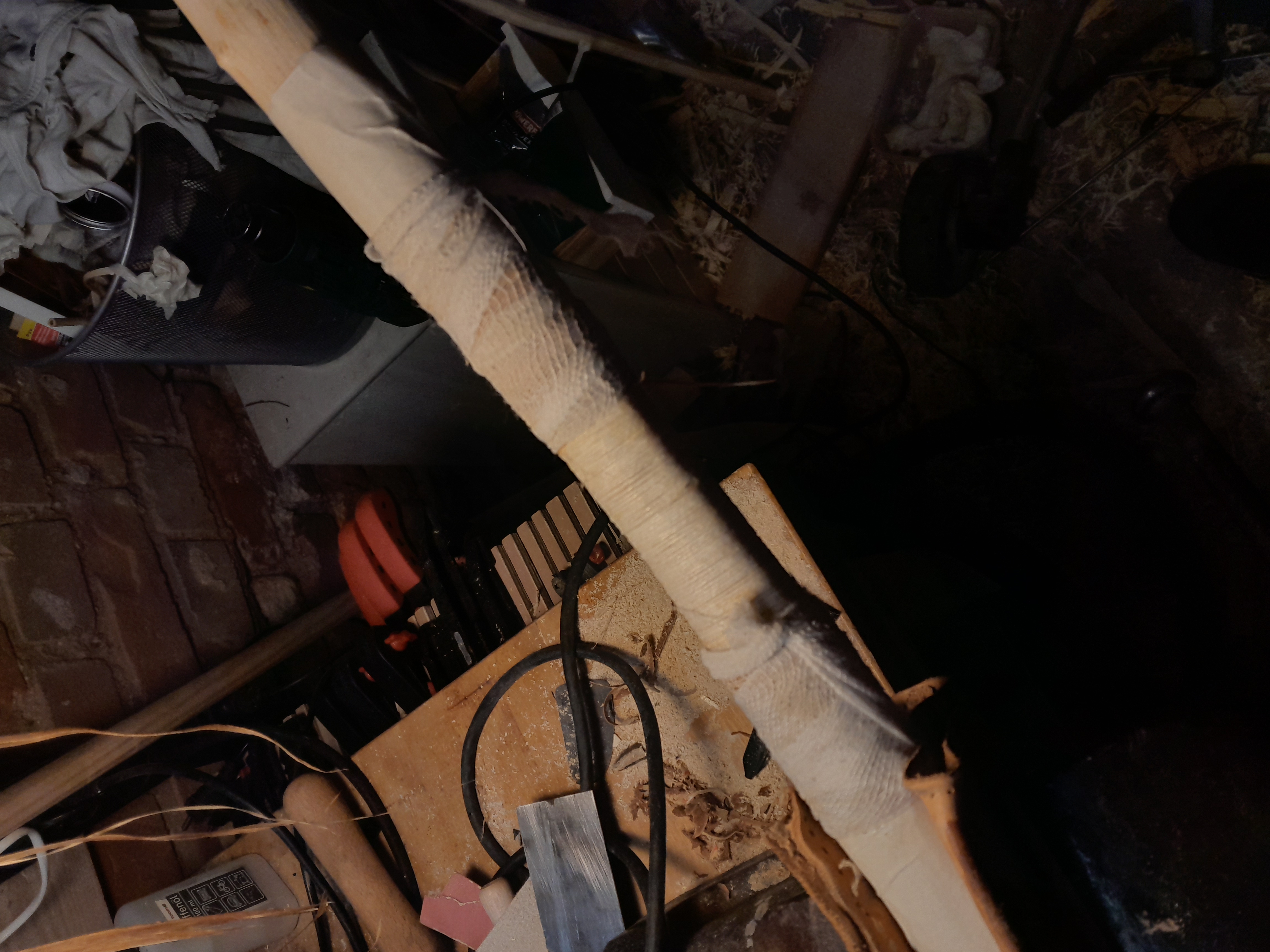 Den Griffbereich hab ich mit Schnur gewickelt, was grad zur Hand war und reißfest. Rollbratenschnur aus Leinen.