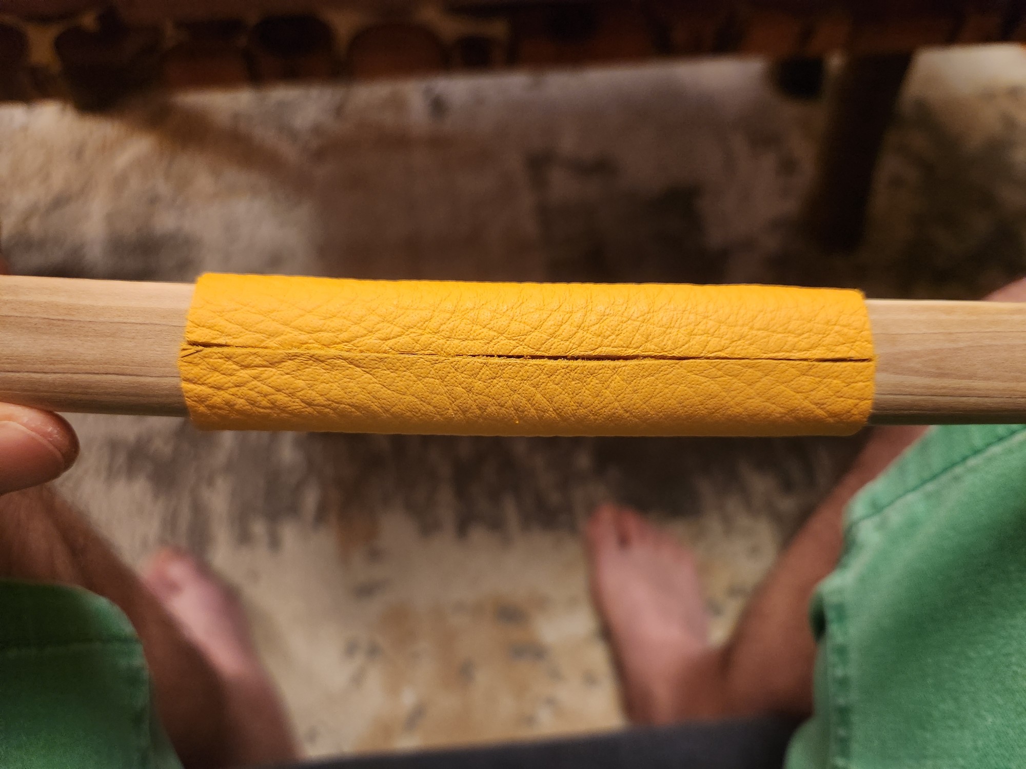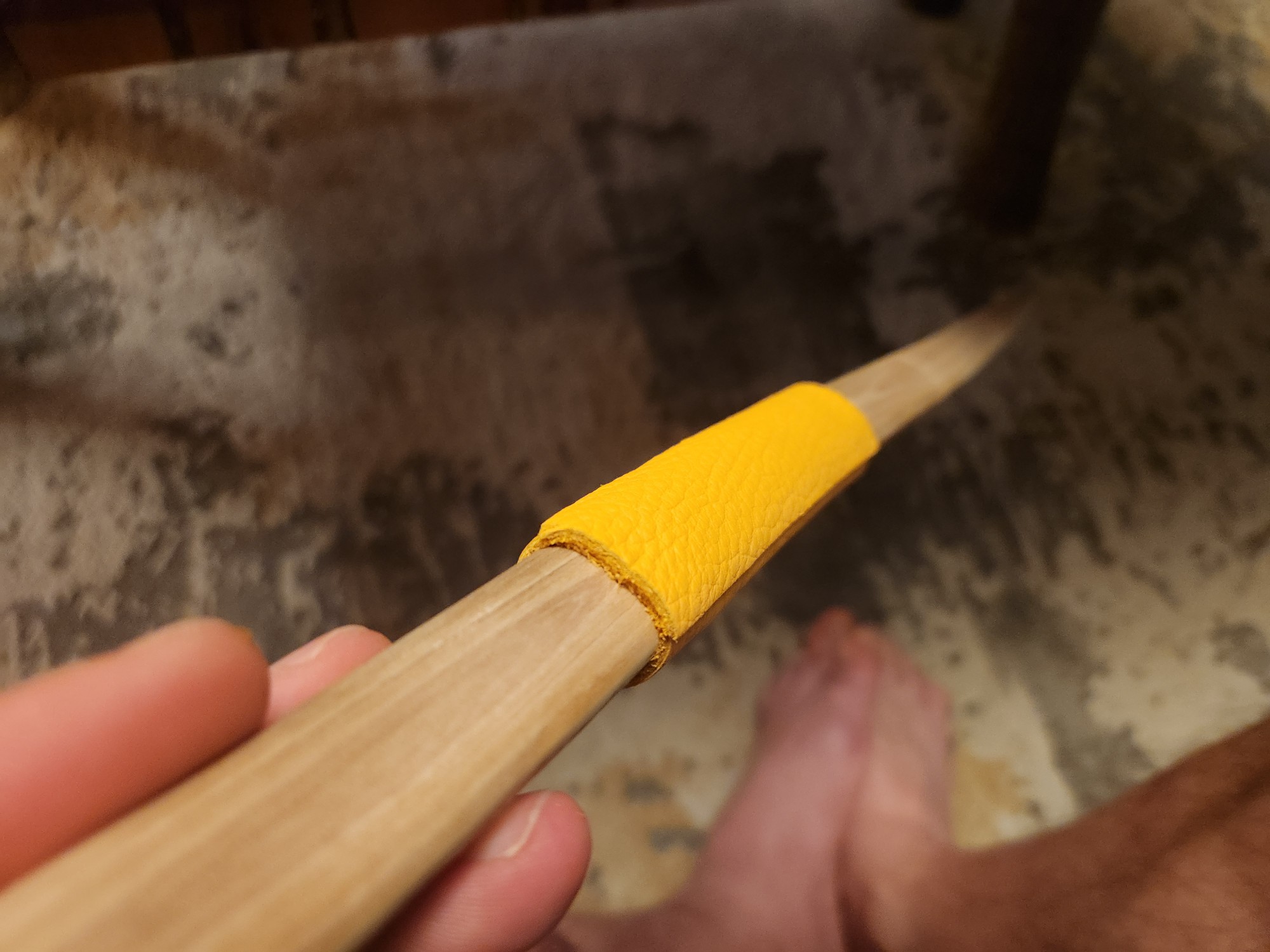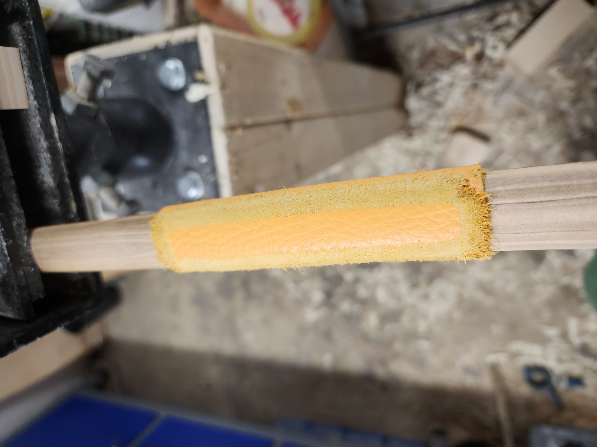 Gestern hab ich den Bogen noch geschliffen und danach den Bauch geröstet. Diesmal aber nicht sooo lange. Mir gings vor allem drum, wieder eine gleichmäßige Bräunung zu bekommen. Ich hoffe ich muss dann nicht nochmal an den Tiller ran... Dann hab ich den Griff mit nem Leder, dessen Farbe ich schäußlich finde, aufgepolstert. Dann hab ich mich für einen Griff aus 2 unterschiedlich breiten Lederbändern entschieden. Ich hoffe da wird nichts locker wenn er im Griff biegt.