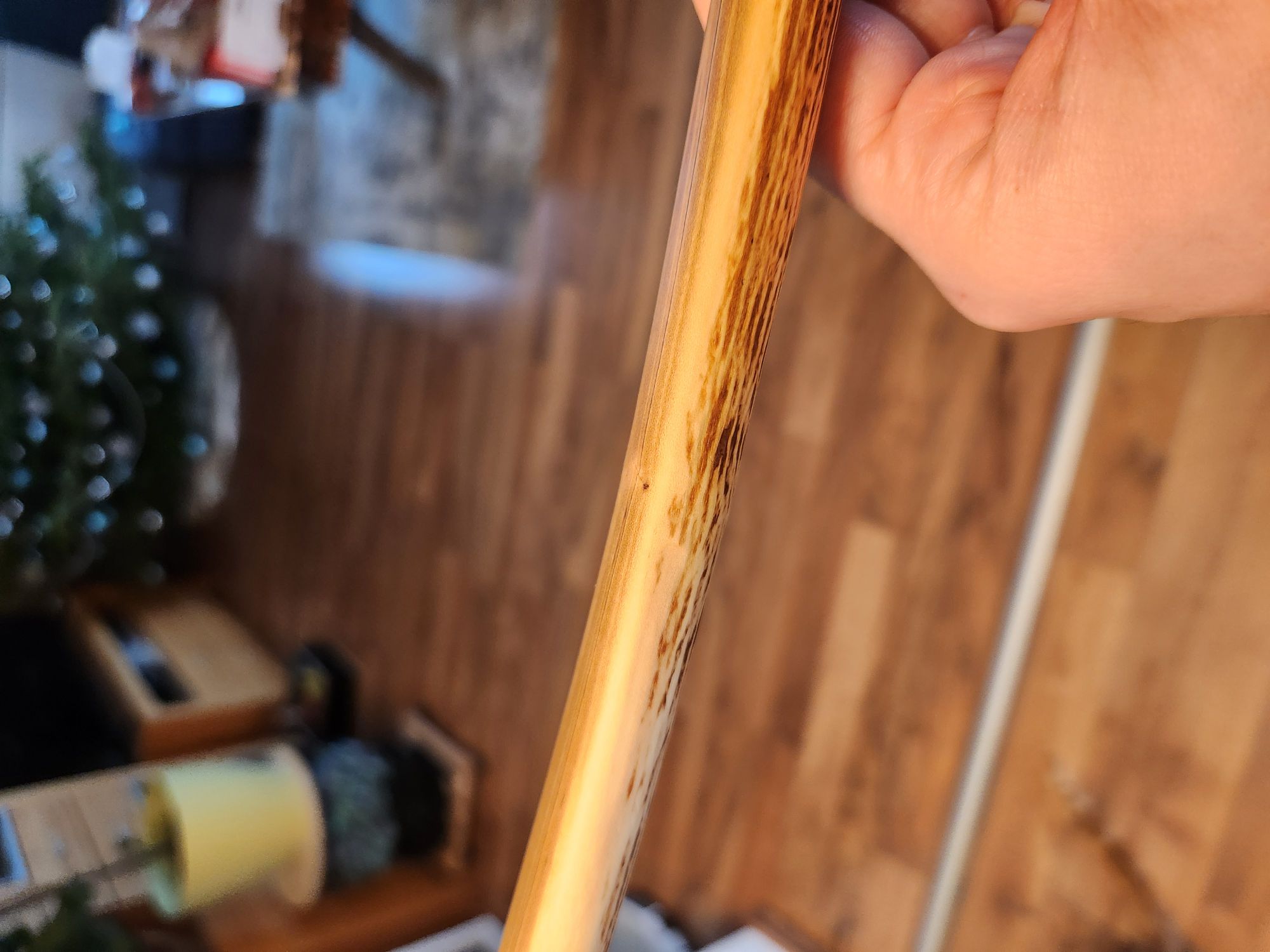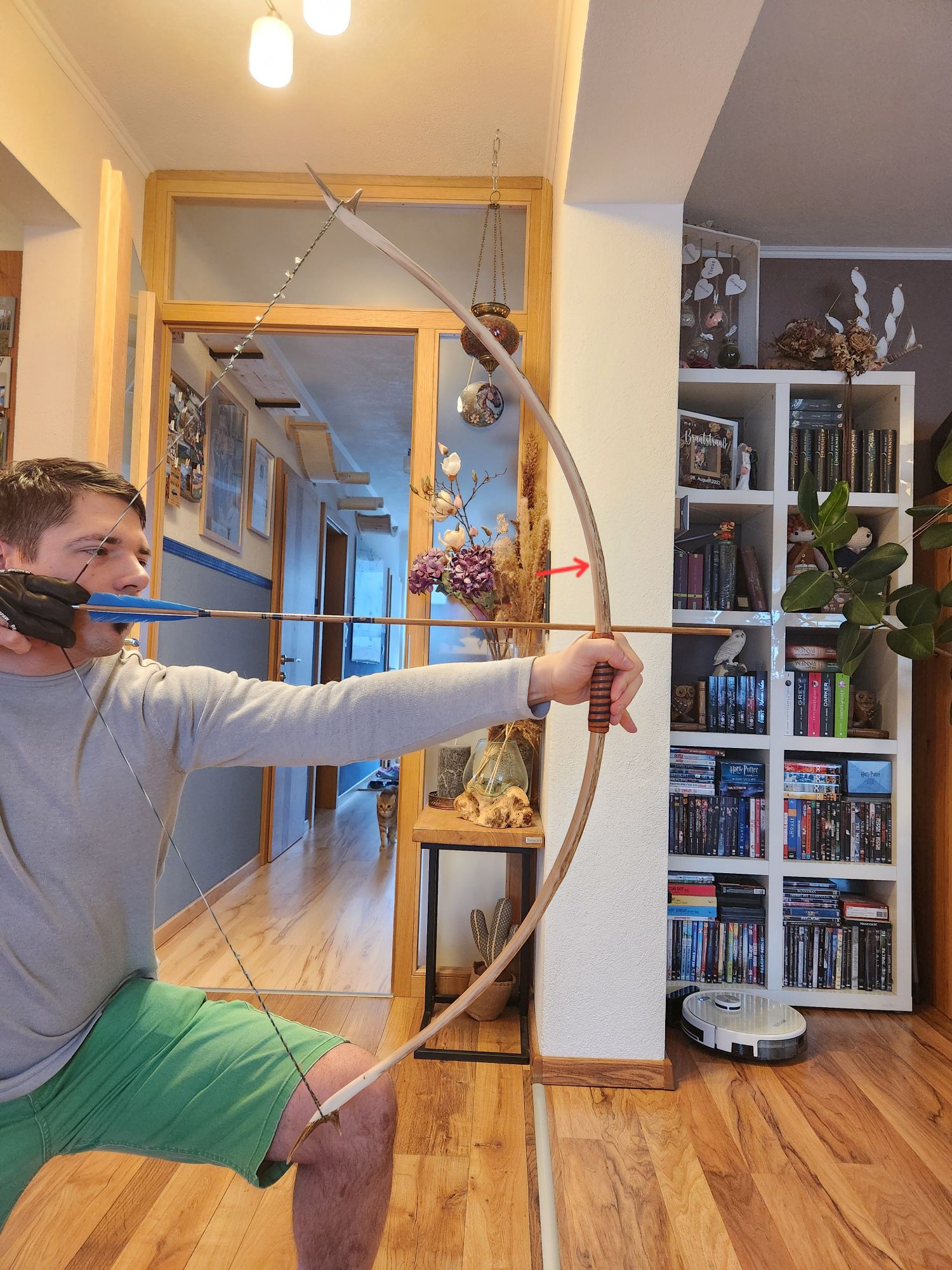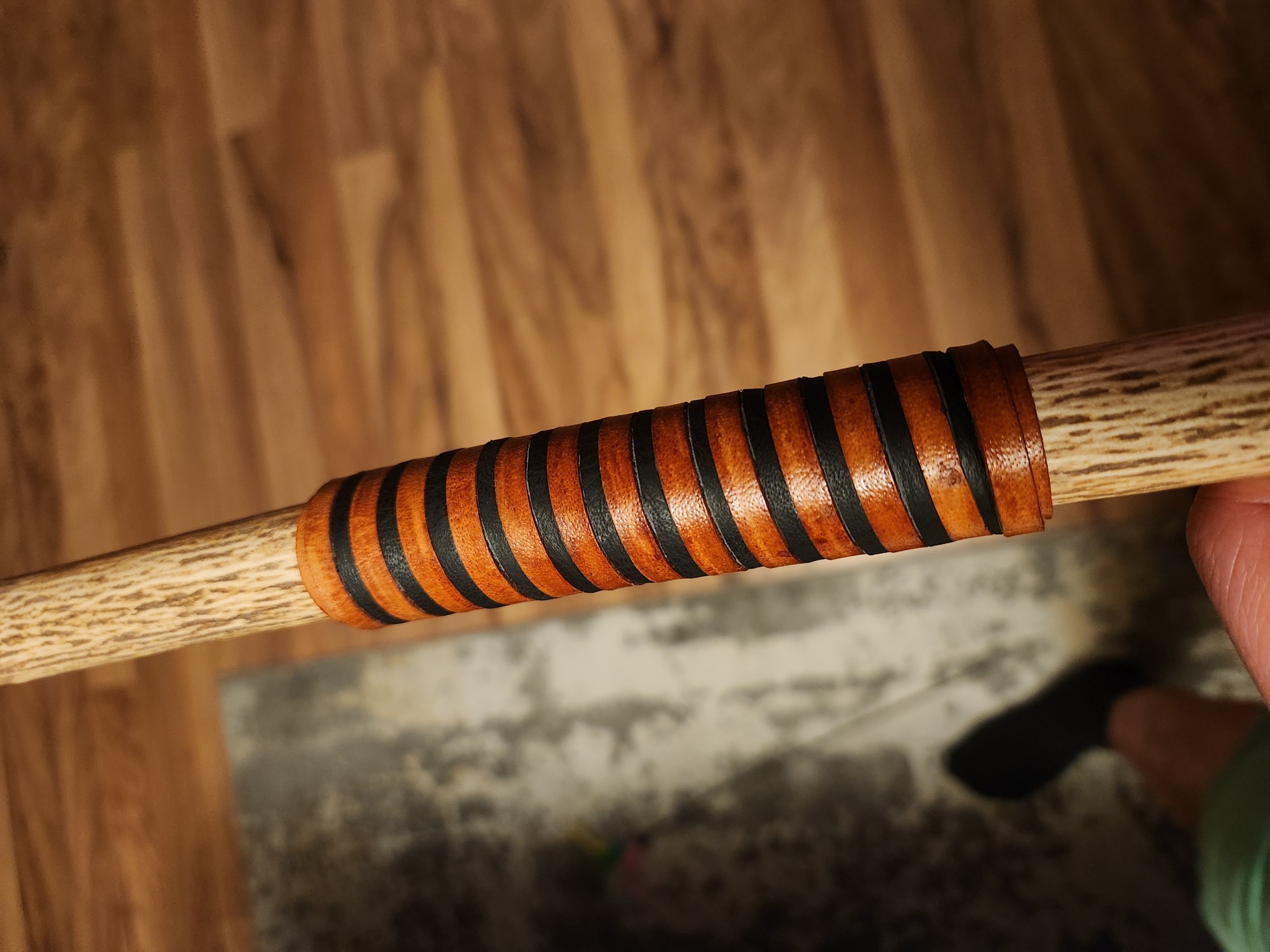 Gestern hab ich den Bogen noch geschliffen und danach den Bauch geröstet. Diesmal aber nicht sooo lange. Mir gings vor allem drum, wieder eine gleichmäßige Bräunung zu bekommen. Ich hoffe ich muss dann nicht nochmal an den Tiller ran... Dann hab ich den Griff mit nem Leder, dessen Farbe ich schäußlich finde, aufgepolstert. Dann hab ich mich für einen Griff aus 2 unterschiedlich breiten Lederbändern entschieden. Ich hoffe da wird nichts locker wenn er im Griff biegt.