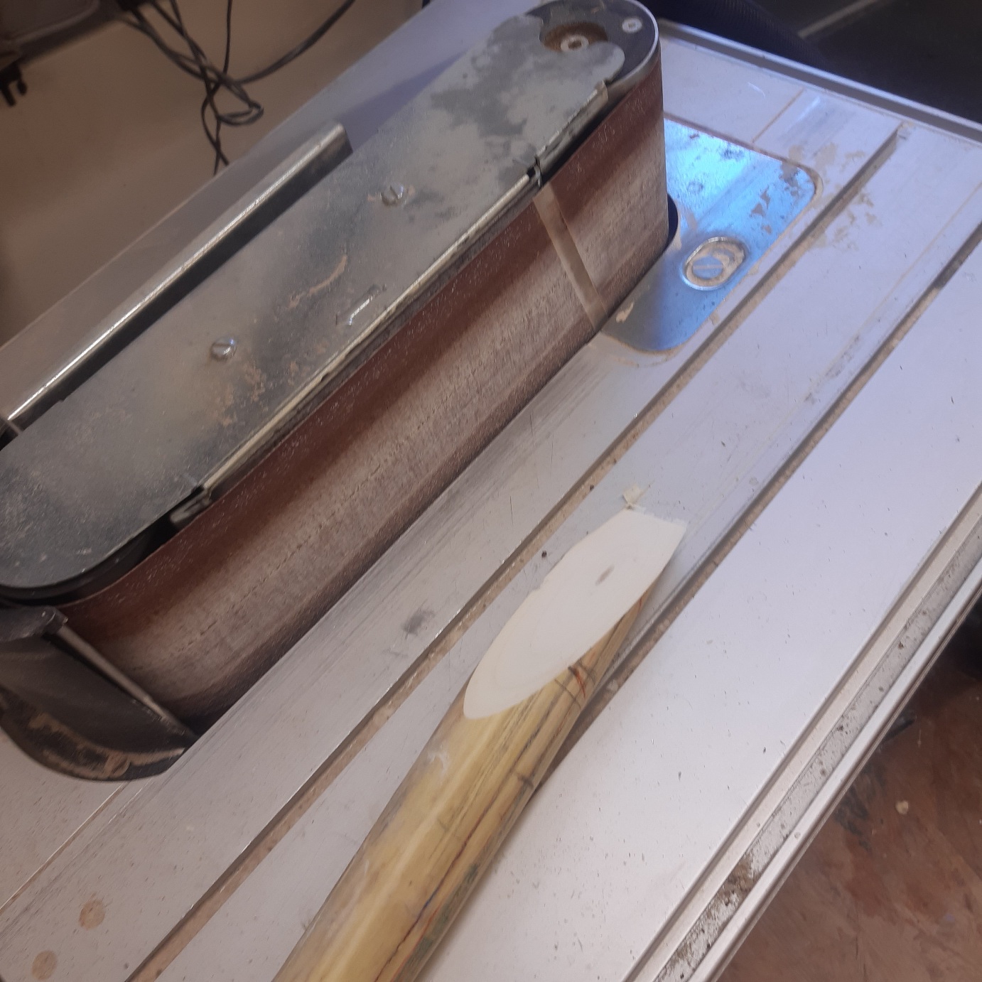 . Also habe ich den Schnitt vollendet und eine Seite mit dem Bandschleifer bearbeitet. Jetzt habe ich schon wieder einen Schrägspleiß