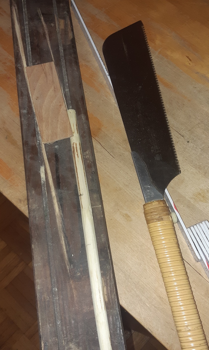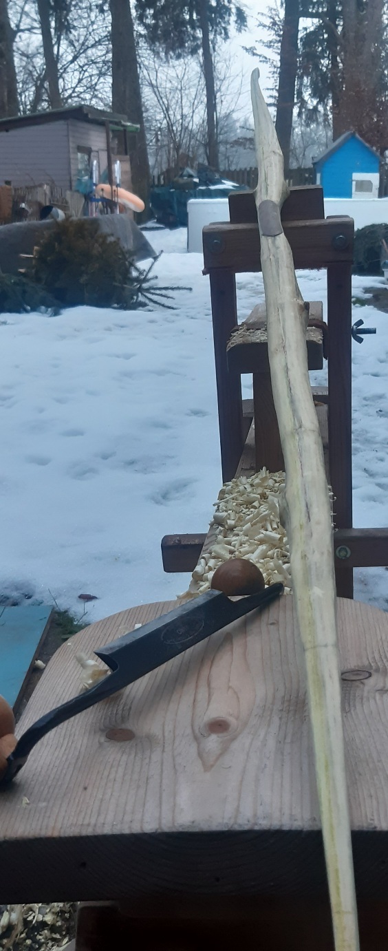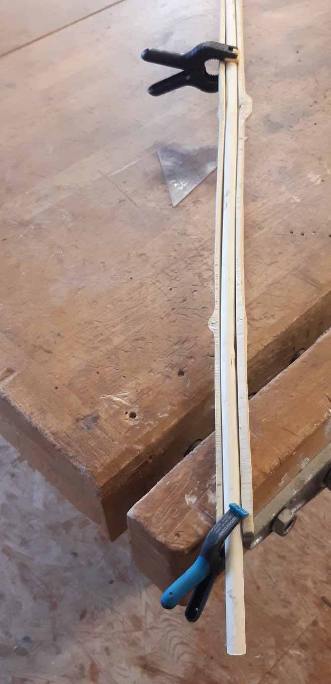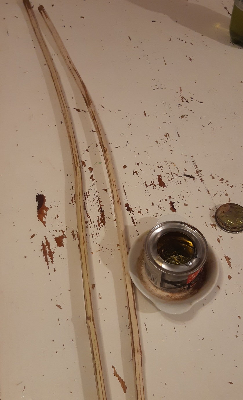 Holler1 hat sich auch weiterentwickelt. In der Pause immer mal wieder den Markkanal weiter mit dem Hohleisen bearbeitet und mit einer Dübelstange und Schleifpapier ausgeschliffen. Hartriegel begradigt und auf 12,5 mm gehobelt. Hartriegelstangen mit Schrägspleiß versehen und mal in die röhre gelegt. Die Fugen sind relativ breit wie erwartet. Zudem den Holler mit der Hlp erwärmt und mit der Hand nach unten gedrückt um den Reflex etwas rauszubiegen. Habe dann meinen Sohn zur Hilfe für den Akkuschrauber geholt. Zwischen zwei Dübelstangen 12mm gelegt und mit einem Brett mit Schleifpapier getackert grob geschliffen. Die Stängel hätten etwas dicker sein dürfen, dann wäre mehr Material zum bearbeiten da gewesen.