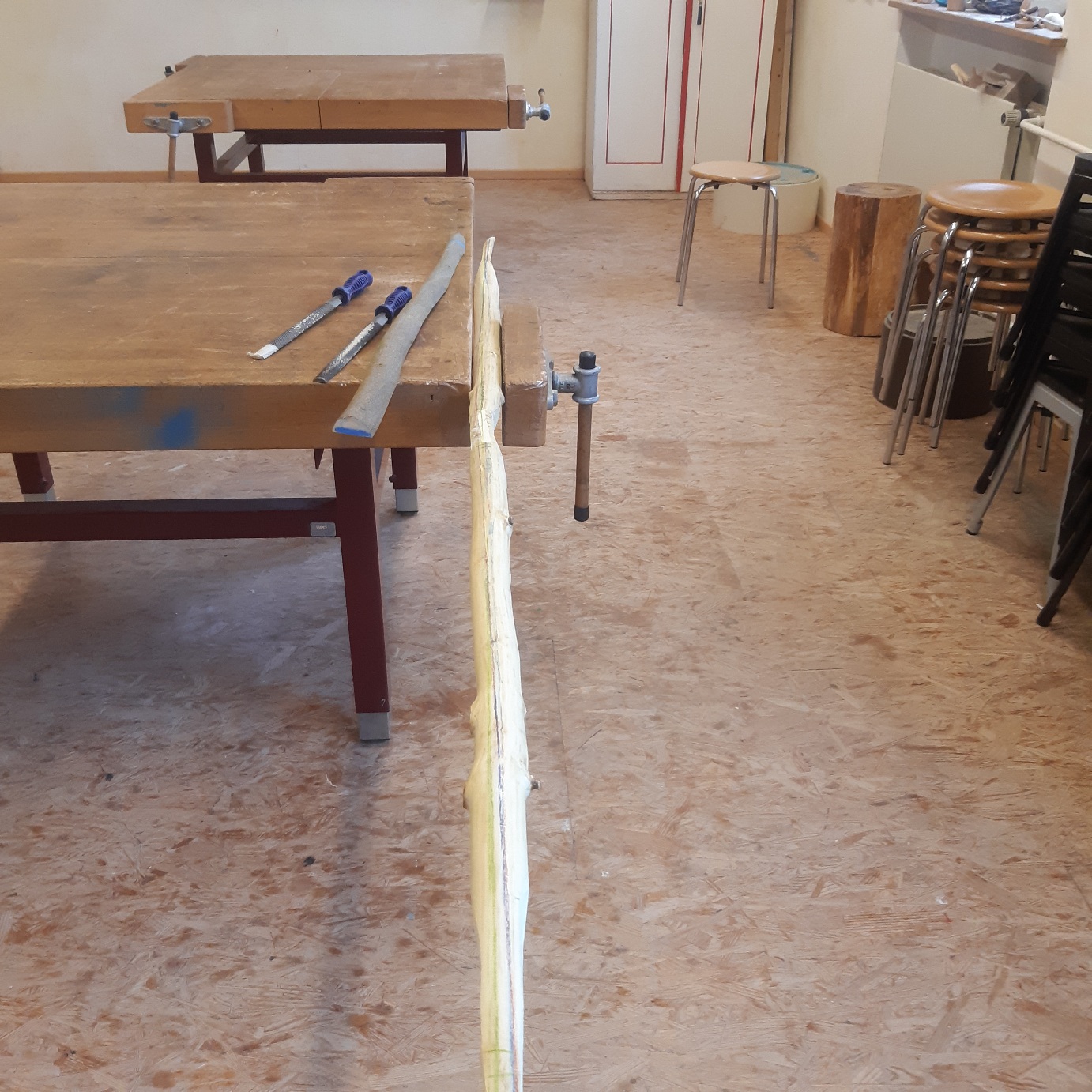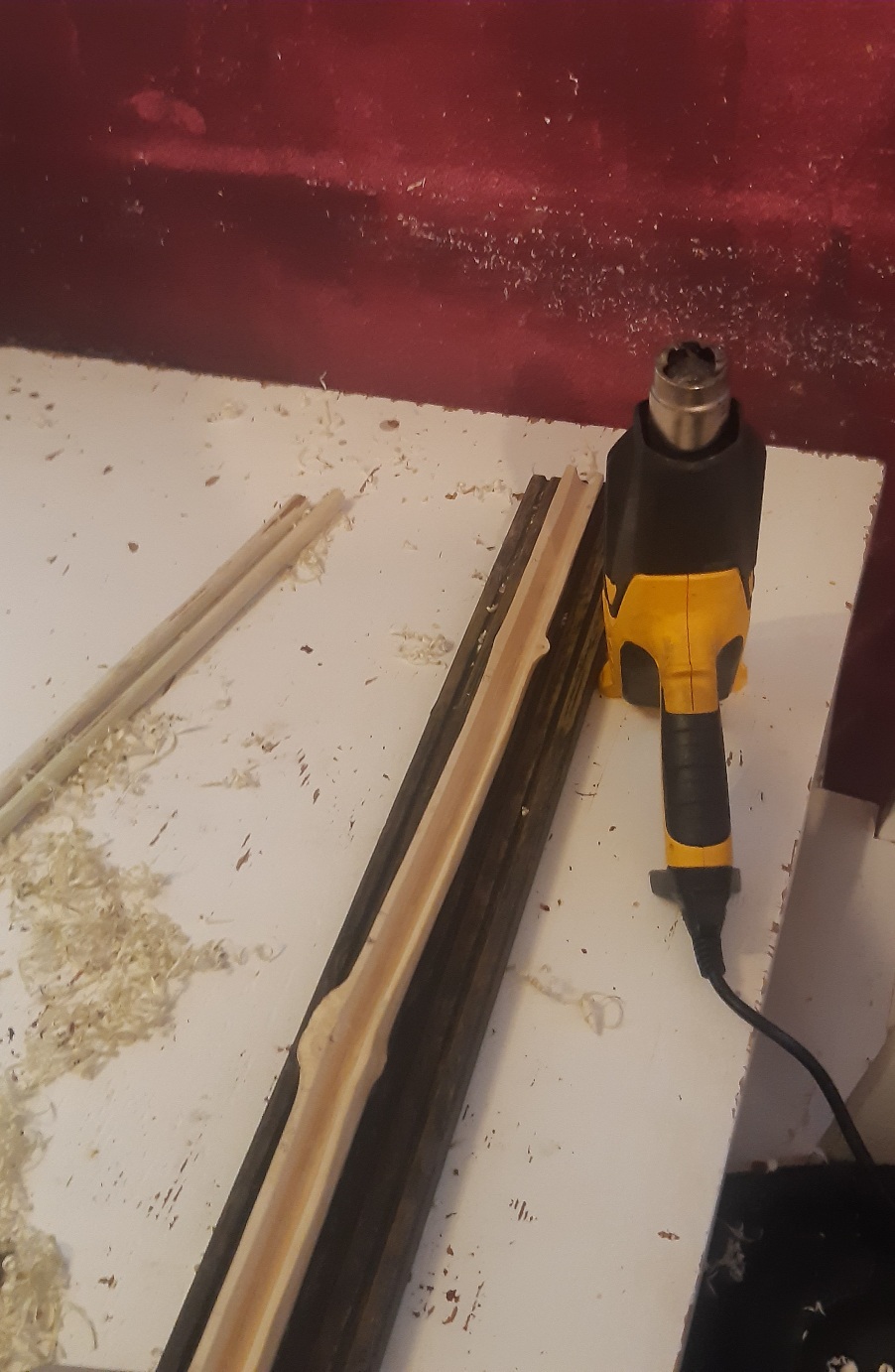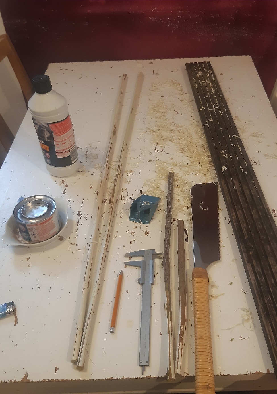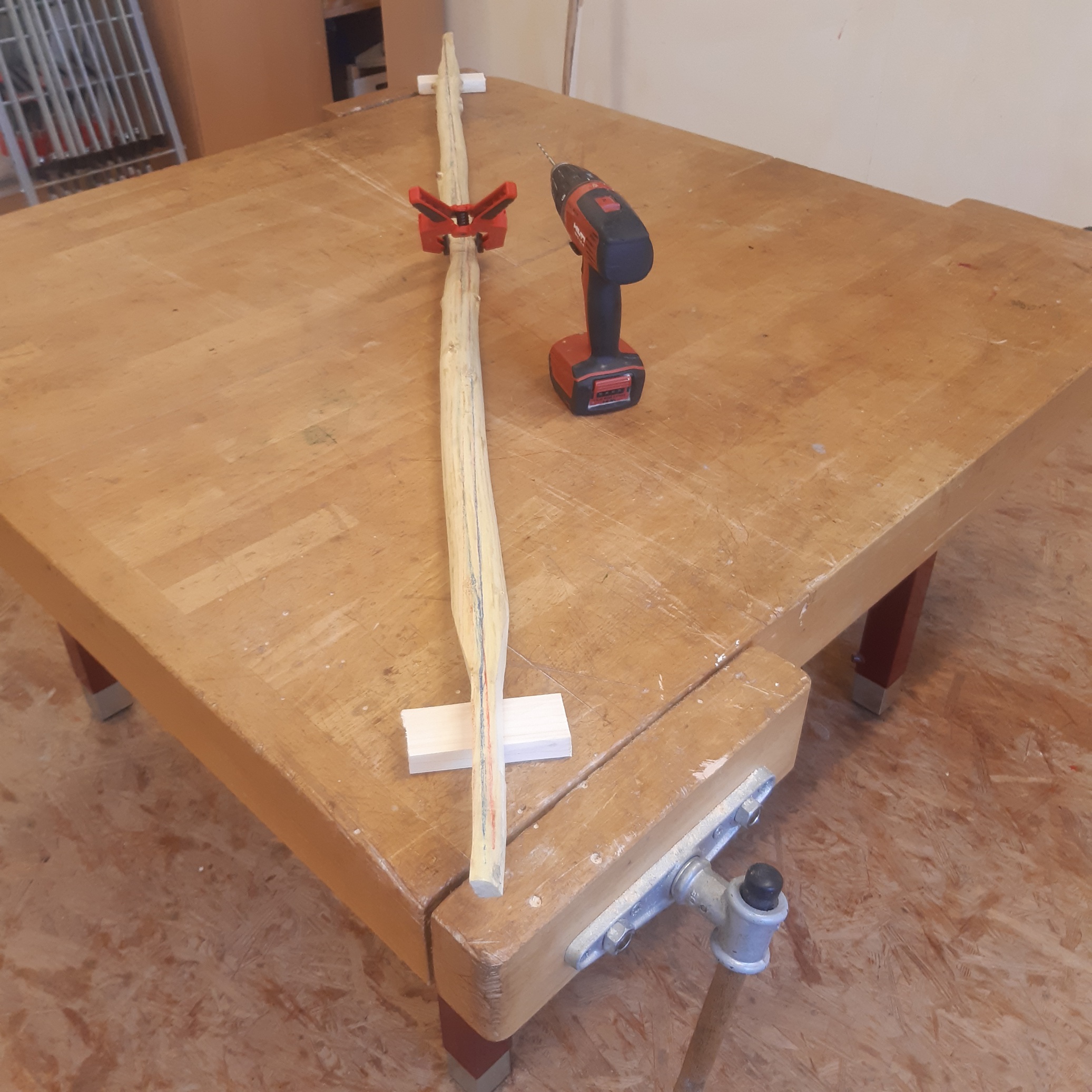 Holler1 hat sich auch weiterentwickelt. In der Pause immer mal wieder den Markkanal weiter mit dem Hohleisen bearbeitet und mit einer Dübelstange und Schleifpapier ausgeschliffen. Hartriegel begradigt und auf 12,5 mm gehobelt. Hartriegelstangen mit Schrägspleiß versehen und mal in die röhre gelegt. Die Fugen sind relativ breit wie erwartet. Zudem den Holler mit der Hlp erwärmt und mit der Hand nach unten gedrückt um den Reflex etwas rauszubiegen. Habe dann meinen Sohn zur Hilfe für den Akkuschrauber geholt. Zwischen zwei Dübelstangen 12mm gelegt und mit einem Brett mit Schleifpapier getackert grob geschliffen. Die Stängel hätten etwas dicker sein dürfen, dann wäre mehr Material zum bearbeiten da gewesen.