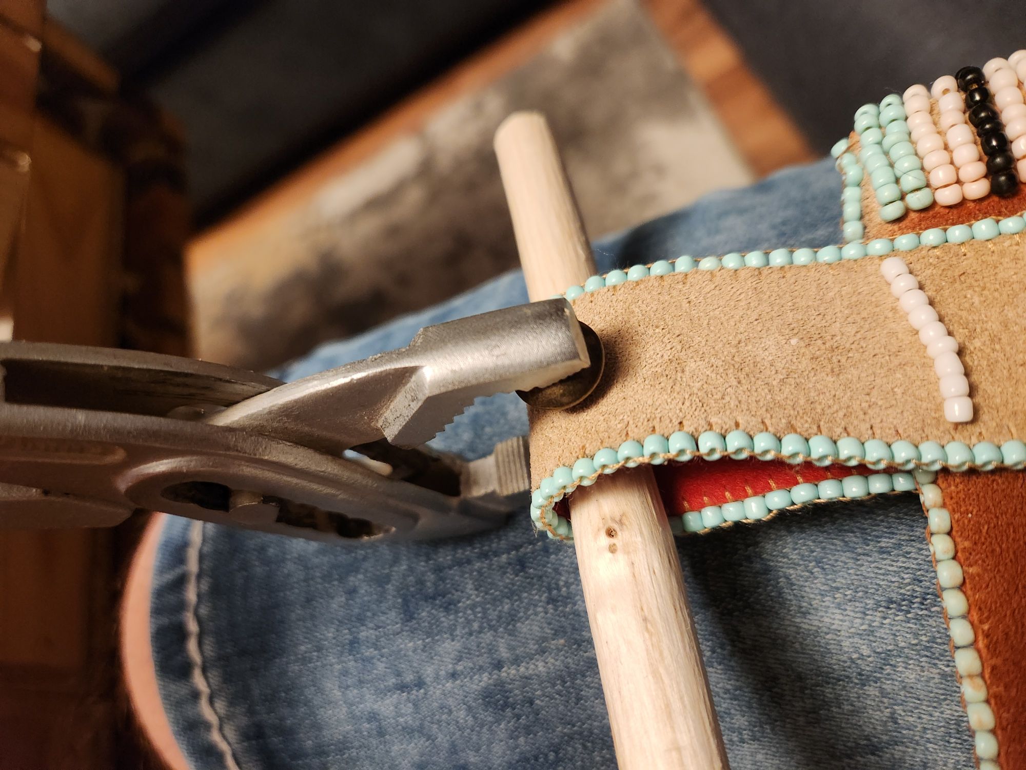 Die Nägel hab ich dann mit der Rohrzange durch die beiden äußeren Riemchen in den Stock gedrückt. Nun konnte ich die inneren Riemchen mittig knicken und über den Stock legen und ebenfalls mit einem Nagel fixieren. Im Anschluss hab ich diese auch am Köcher festgeklebt und angenäht. Diese Vorgehensweise hab ich für nötig erachtet da mein Köcherstock sich beim trocknen in einer Achse verzogen hat, und somit die Riemchen unterschiedlich weit überstehen mussten.