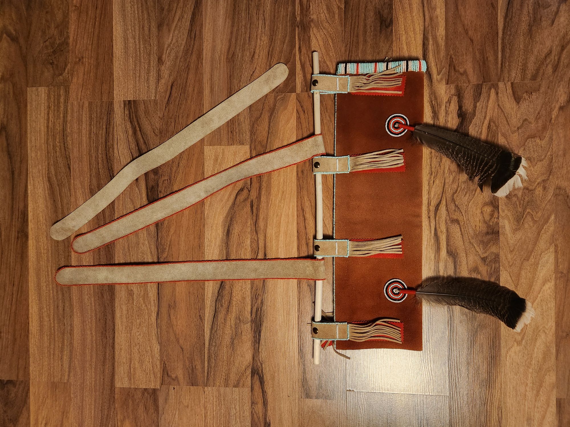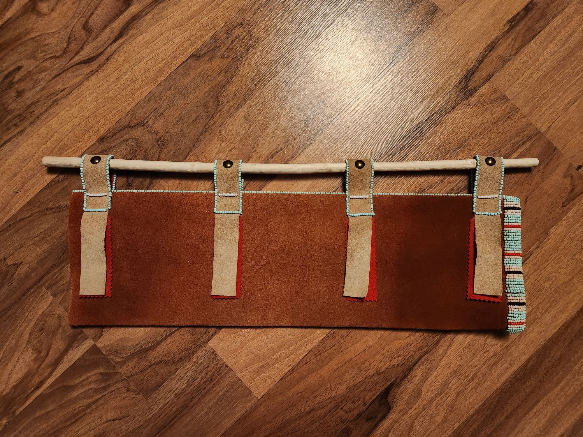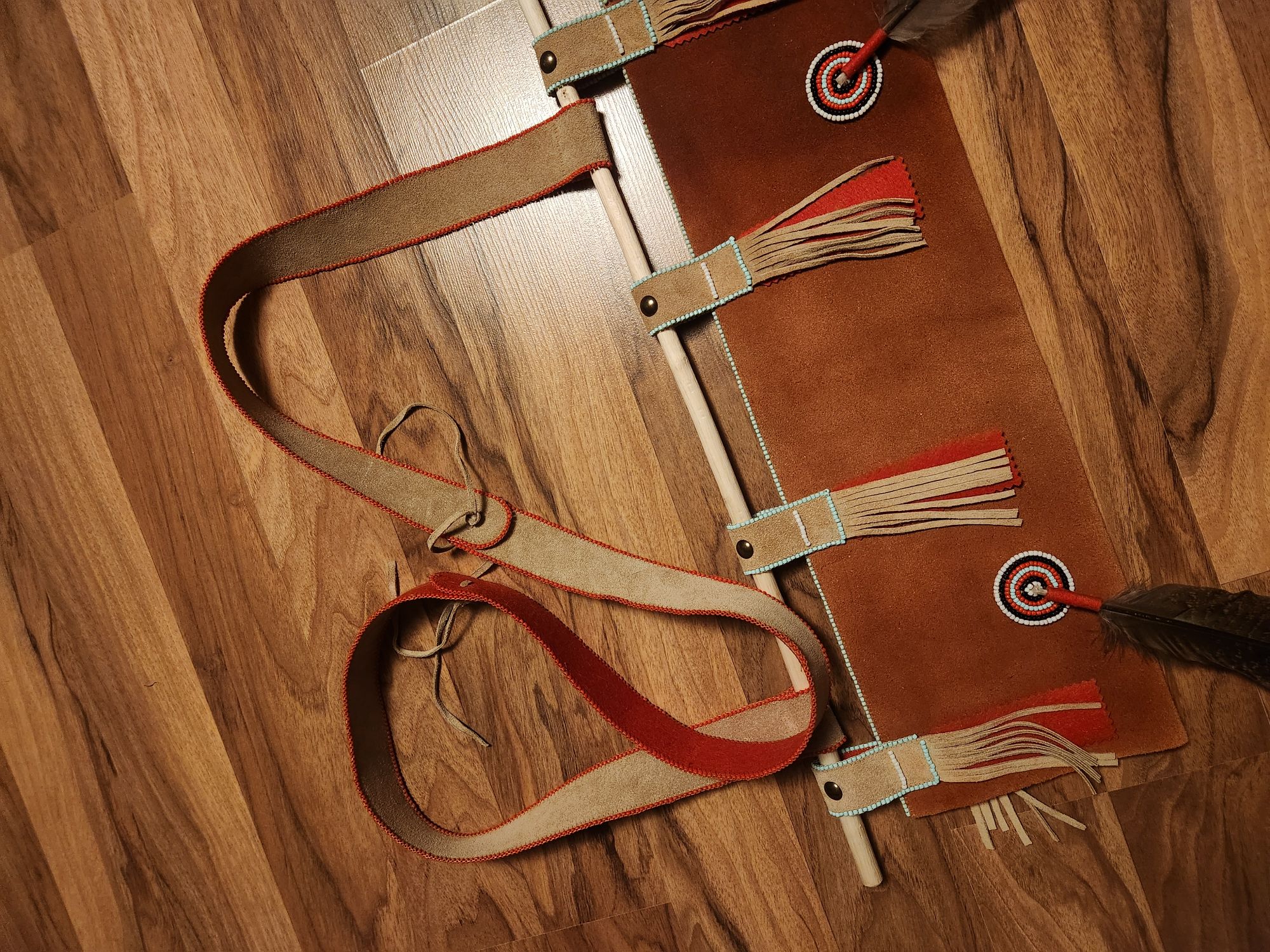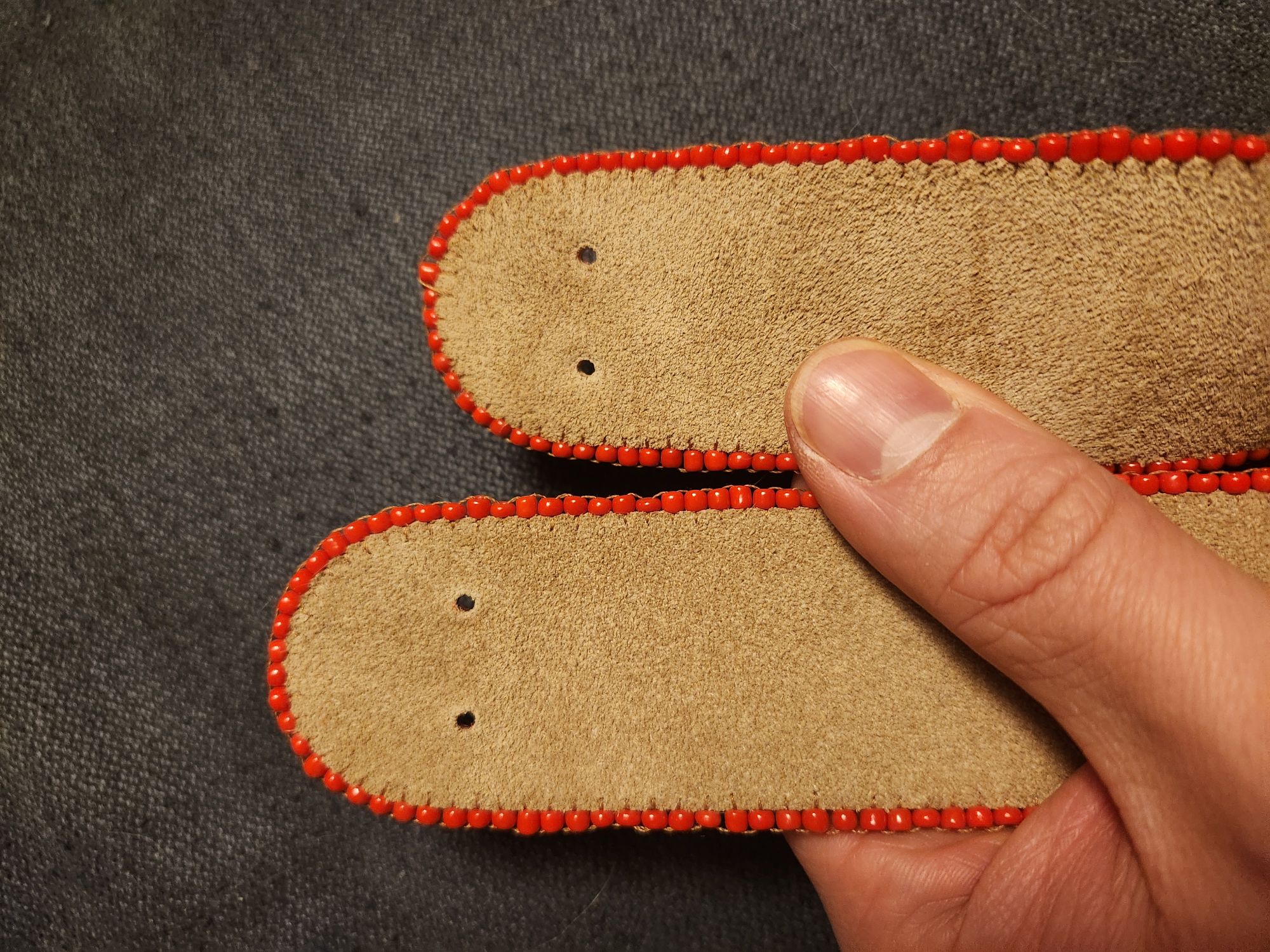Den Umhengeriemen hab ich auch am Köcher festgenäht. Den Mittleren der 3 Riemen hatte ich aber noch nicht mit Perlen eingefasst da ich dachte ich müsste ihn noch kürzen. Tatsächlich scheint die volle Länge aber gut zu passen.