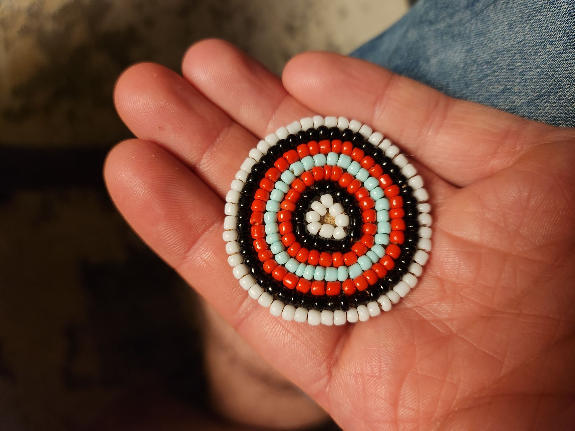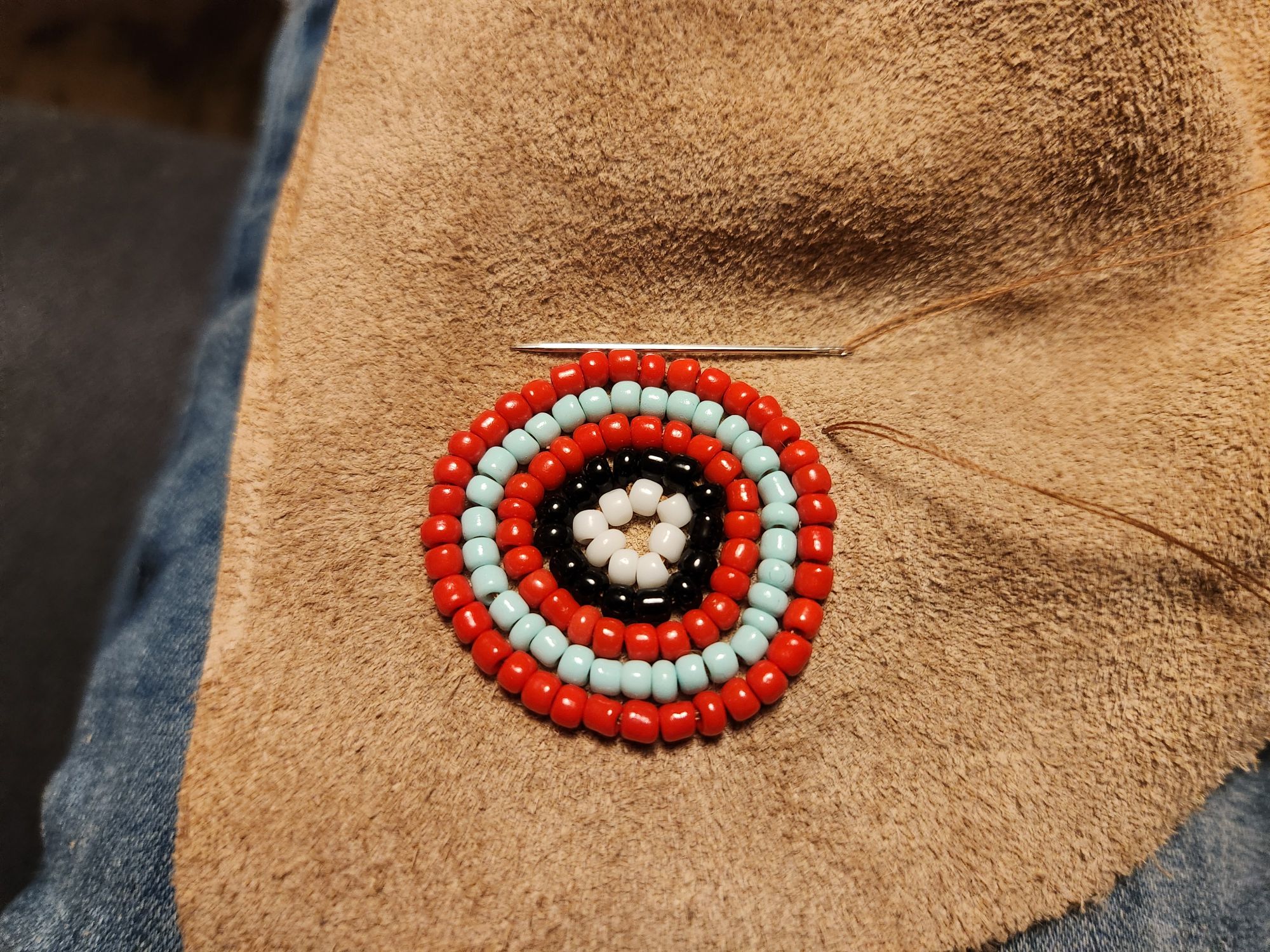 Dann hab ich schon mal eines der Zierelemente genäht. Einfach Reihe für Reihe von innen nach außen im Kreis Perlen auf ein Reststück Leder nähen. Dann bei einer Feder die unteren ca 4cm bis zur hälfte abtragen und dann umklappen und das Ende in den Kiel schieben und festkleben sodass eine Schlaufe entsteht. Mit dieser Schlaufe kann man die Feder dann an das Zierelement nähen. Den Kiel hab ich dann noch mit dem Futtermaterial (Filz) umwickelt und festgeklebt. Dann das Zierelement auf den Köcher geklebt (Achtung, hier müsst ihr bedenken was die Sichtseite sein wird) und festgenäht.
