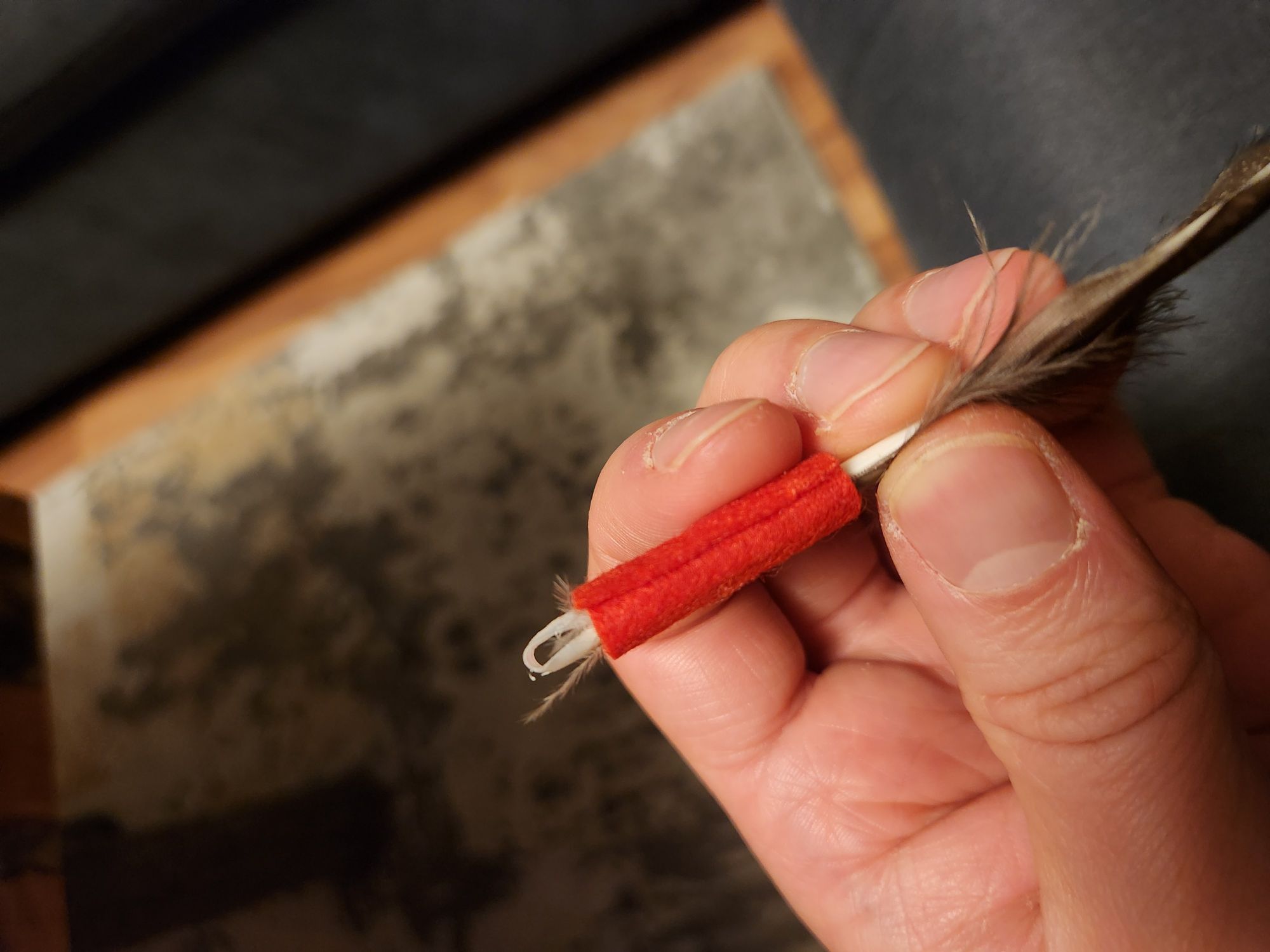 Heute hab ich das zweite Zierelement mit Feder gefertigt und angenäht. Das dritte hab ich auch schon gefertigt aber noch nicht befestigt, denn da soll eine Strähne Pferdehaar dran, die ich erst noch vom Pferd meiner Frau stibizen muss