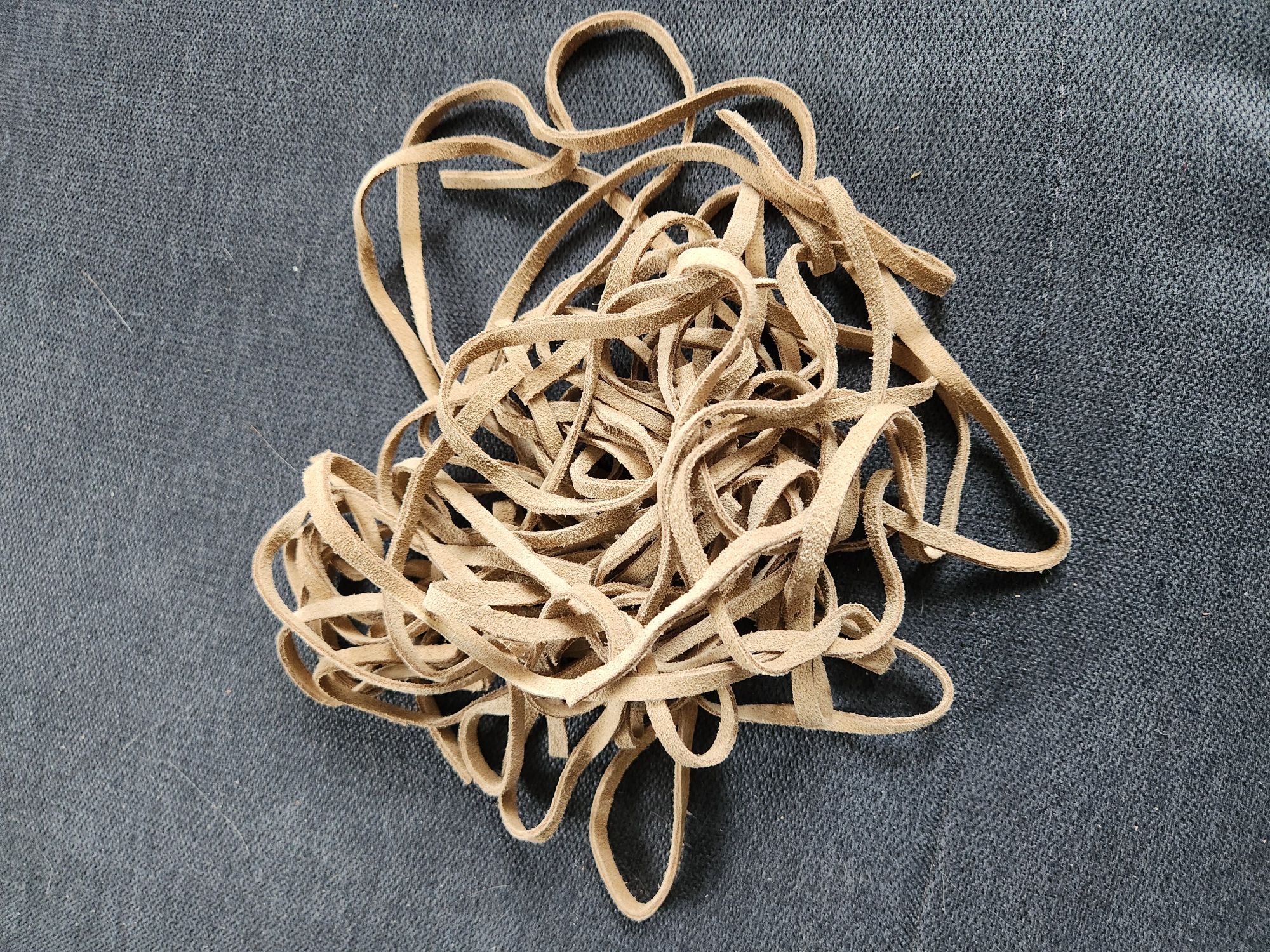 Nebenbei hab ich auch schon aus Lederresten die Fransen für die Verschnürung des Köcherbodens zugeschnitten.