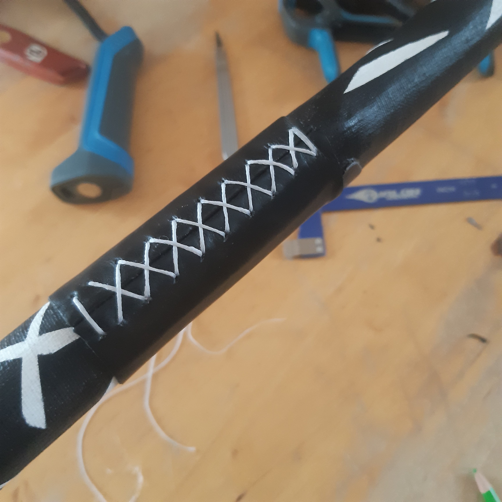 Dann jede Menge Schleifpapier verwendet. Meinen ersten Arrowpass aufgeklebt, da ist noch Luft nach oben. Anschließend das Horn mit 400 und 1000 Schleifpapier poliert. Für das Finish abgeklebt, erste Schicht in weiß lackiert und trocken geföhnt. Für das Muster jede Menge Malercrepstreifen geschnitten, aufgeklebt und zweite Farbschicht aufgetragen und wieder föhnen. Alles Malercrep abgemacht. Um 24 Uhr endlich Feierabend. Heute morgen um 5Uhr Klarlack auf eine Seite nach 2 Stunden auf der anderen Seite aufgetragen.Die zweite Schicht bekommt er nach dem Fotoshooting. Leder für den Griff zugeschnitten, gewässert und am Griff trocknen lassen. Anschließend vernäht, allerdings nicht geklebt, ist aberleicht feucht vernäht worden. Ich hoffe das hält. Zwischendurch die Sehne gedreht muss ich gleich noch ausprobieren ob sie passt. Fotos habe ich leider etwas vernachlässigt.