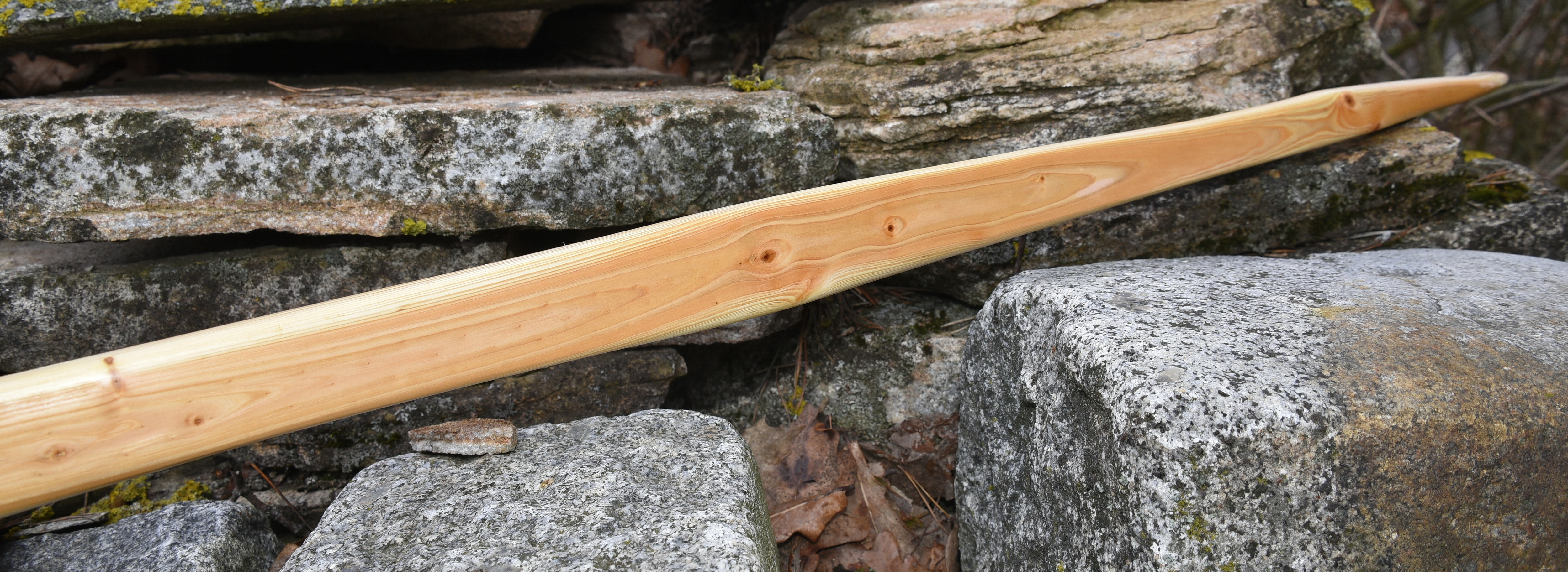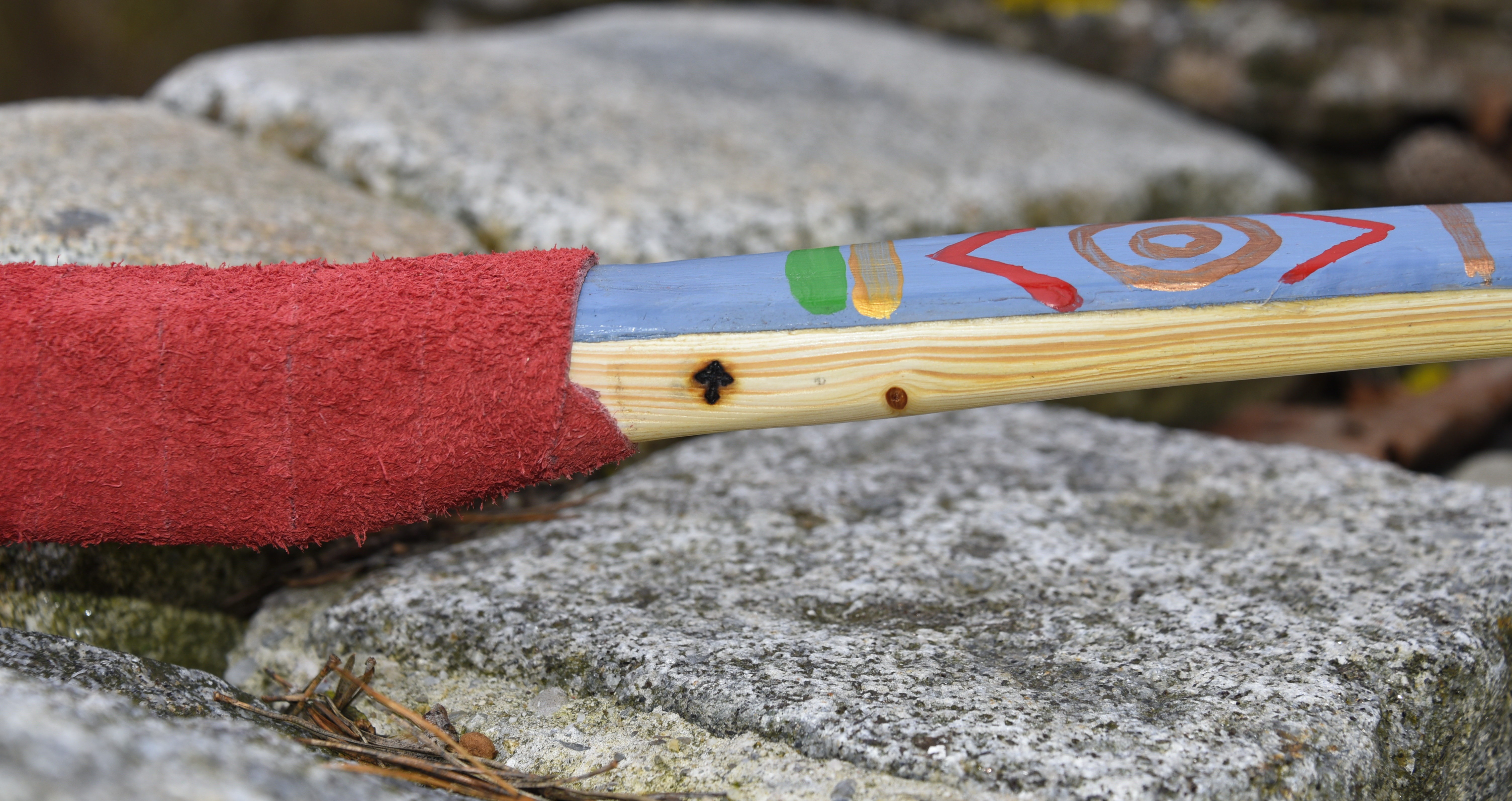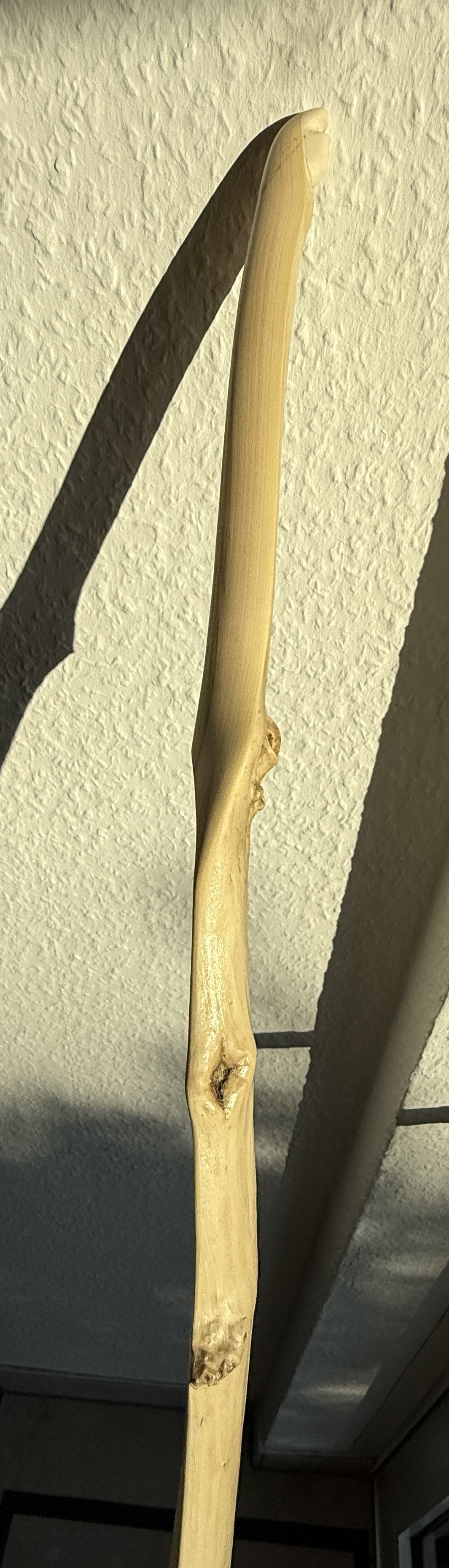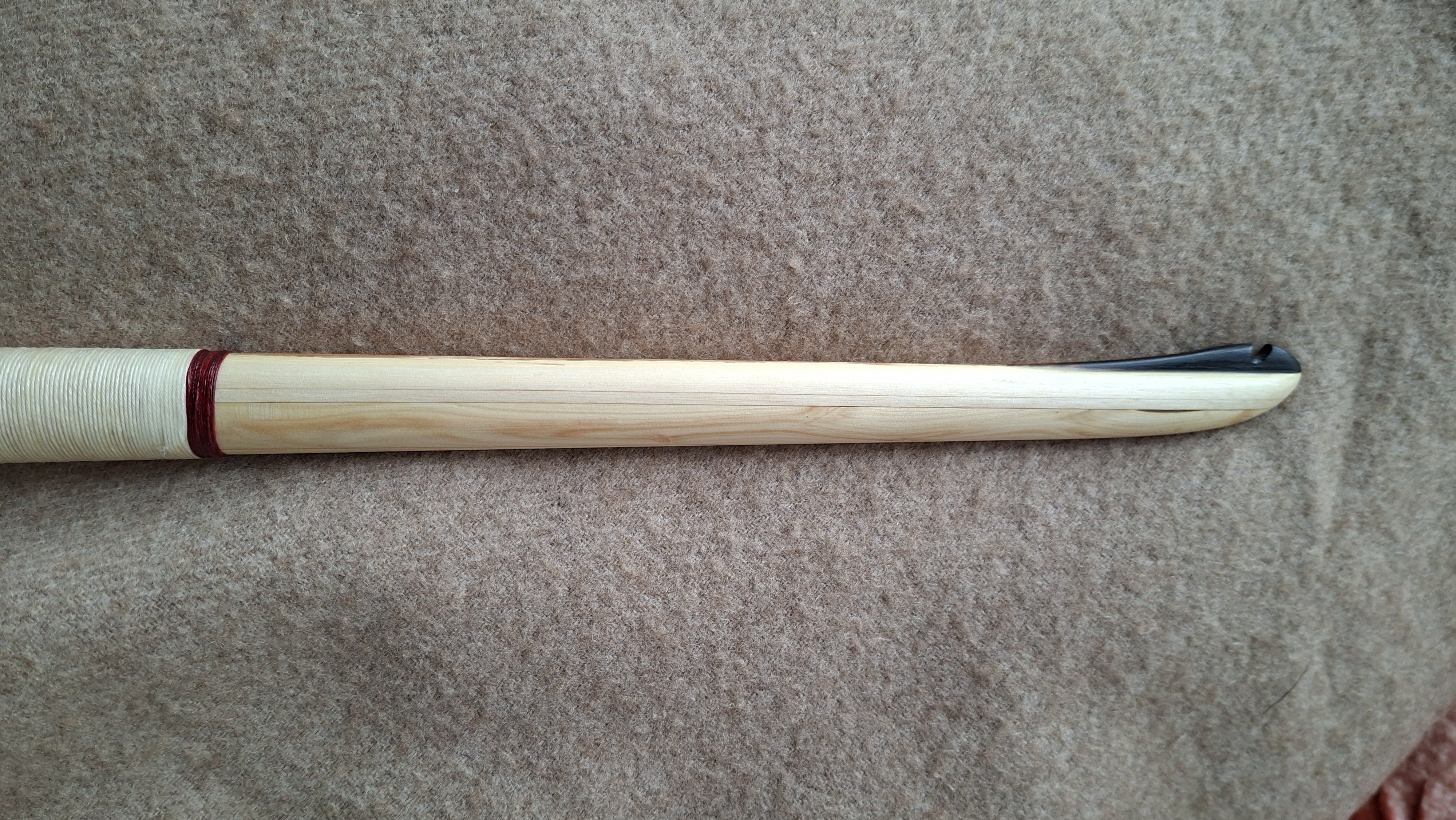 Ein sehr kurzer Stabbogen aus einem Stängel von nur 22mm Durchmesser aus einer Hartriegelhecke in meinem Garten. Die Sehnenlage hatte sich immer wieder beim Aufspannen verzogen weshalb ich ihn gekürzt habe und schließlich den Bogenbauch sehr einseitig abgetragen habe. Nun passts. Oberhalb des Griffs knitterte er heftig wegen eines quer sitzenden Astes. Deshalb war eine Reparatur nötig. Diese ist unter Nutriafell versteckt. Der Bogenbauch ist leicht geröstet.