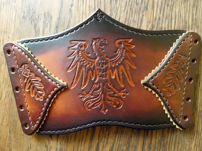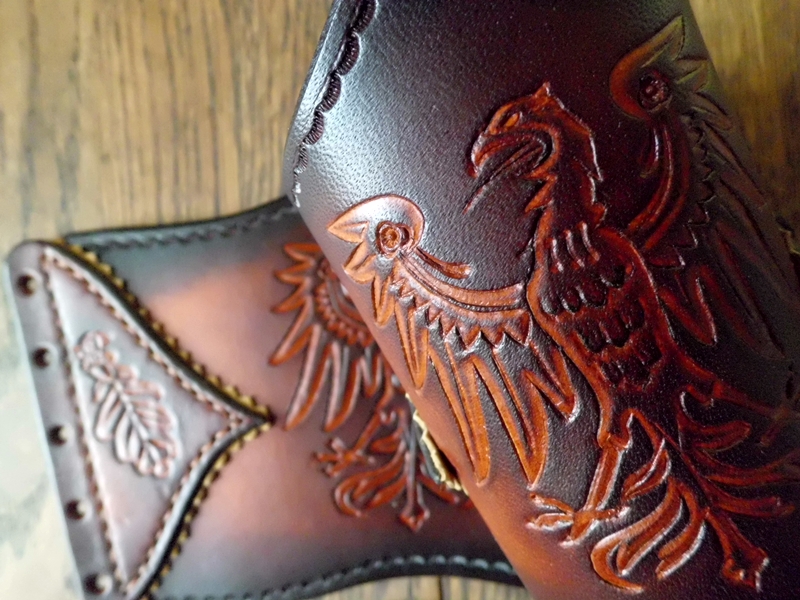 Ich habe ein Paar Armstulpen zum Thema beizusteuern. Die Armstulpen wurden für den Mittelaltermarkt auf Burg Stargard angefertigt. Der Adler ist das Wappentier der Askanier die das Burgfest ausrichten.