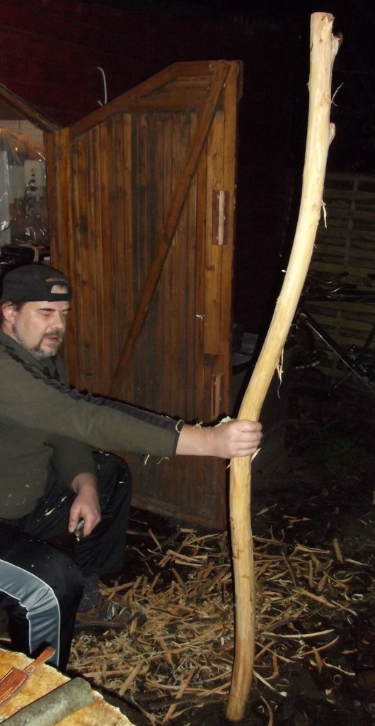 Esche am Samstag geerntet. Durchmesser 6cm auf 5 cm. Länge 175cm. Entrindet und auf den Markkanal abgearbeitet. Mit Leim versiegelt.