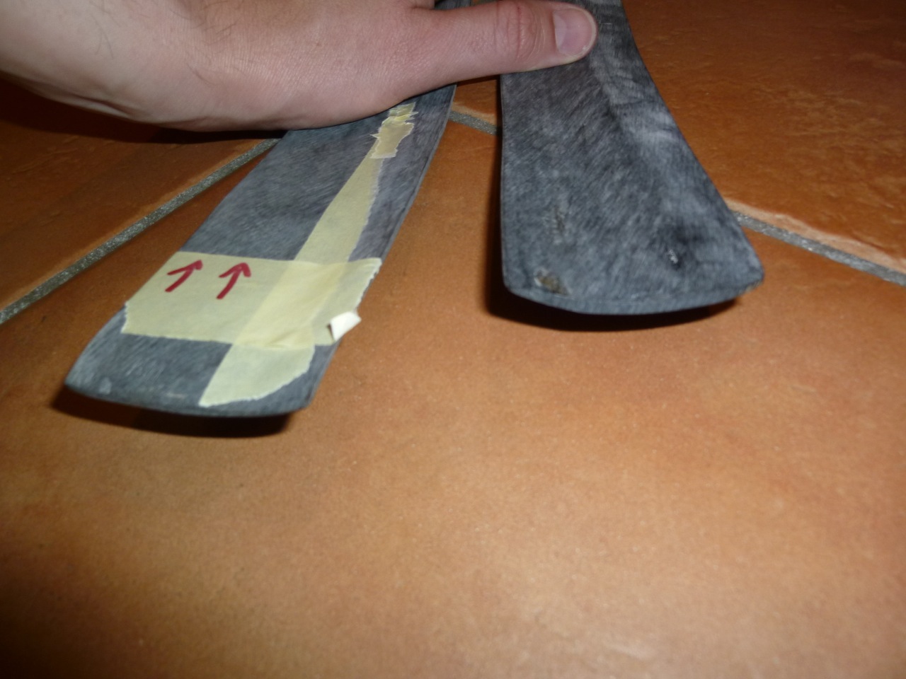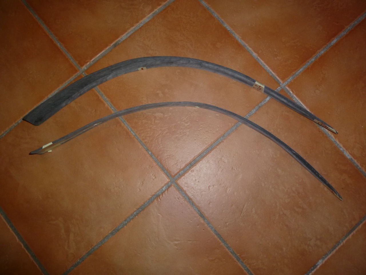 Vermutete Problemstellen habe ich mit Tape markiert. Die Nr 1 hat am breiten Ende eine etwas ausgedünnte Stelle, die hier mit dem länglichen Tape markiert ist. Auf halber Länge kommt nochmal eine ausgedünnte Stelle. Gegenüber sind drei, vier ganz kleine Querkerben. Hier wird es wohl möglich sein, den endgültigen Streifen von der breiten Seite aus zu gestalten, so dass die Spitze des Horns auch Richtung Nocke zeigt.