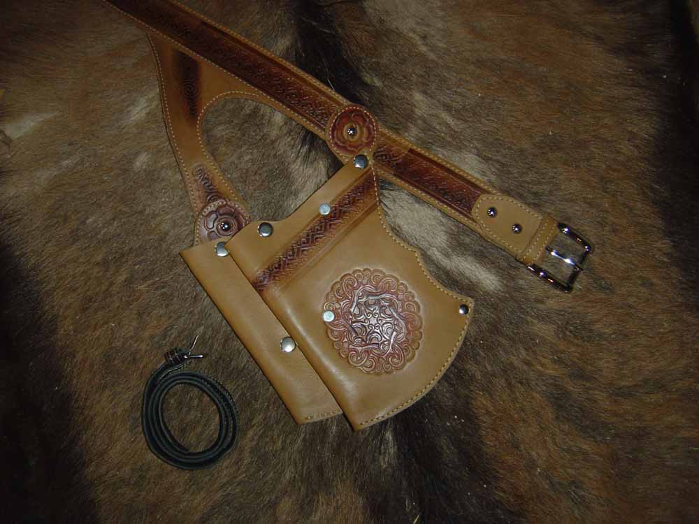 Gesehen hab ich auch schon so was: Nur is mir nicht klar, wie es praktisch funktionieren soll, weil man nicht sieht, wo der auf der Köcherrückseite angebrachte Riemen hinführt.