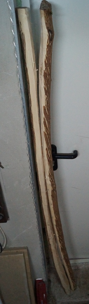 Dann habe ich vor kurzem noch einen schön großen Hartriegel gefällt. Er hatt unten 12 cm Durchmesser gehabt und gab einmal 170 und einmal 160cm Länge ab (Eigentlich ist der kurze Stave auch 175 cm Lang aber ein großer Ast ist dann direkt in Tippnähe was mir weniger gefällt) . Da ich wieder keine Bandsäge hatte habe ich ihn dank ausreichender Dicke gespalten was bis auf den ersten Versuch sehr gut funktionierte. Der erste Spalt verlief leider zu Stark wodurch der schönste Stave ruiniert wurde :(