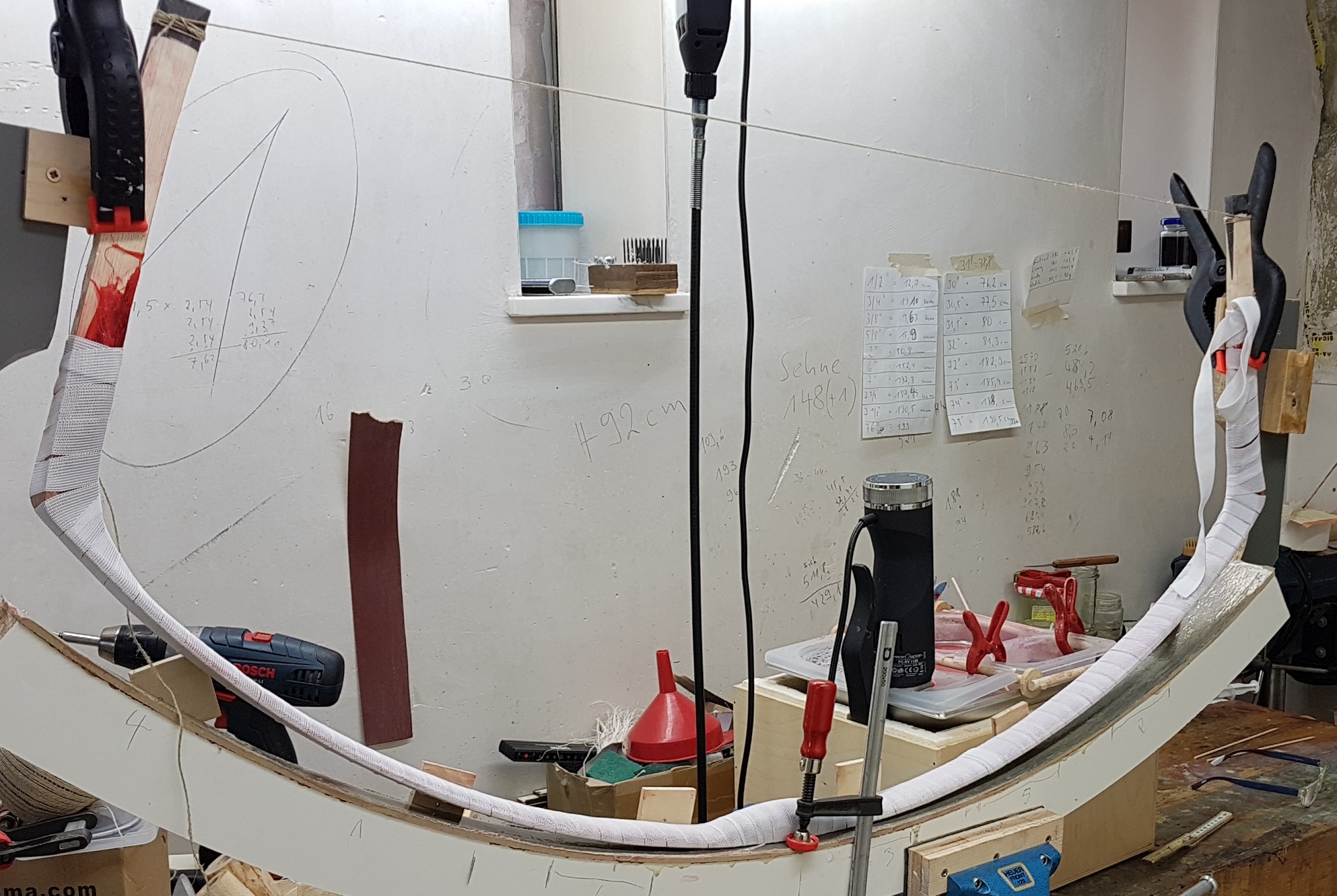 Leider hat sich der seitliche Verzug des Bogens doch nicht korrigieren lassen - da unterlag ich einer Täuschung. Die zusätzlich aufgebrachten Sehnen habe ich wieder runter gefeilt. Dann hatte ich geprüft, wo der Fehler liegt und tatsächlich ist es so, dass die Sehnen sich wohl auf einer Seite etwas stärker zusammen gezogen haben. Ich konnte das mit Transparentpapier gut sichtbar machen (Bogen aufgelegt, Radius abgezeichnet und dann alles rumgedreht und man konnte gut sehen, dass auf einer Seite der Radius größer als auf der anderen Seite ist. Und das ziemlich gleich auf beiden Wurfarmen).