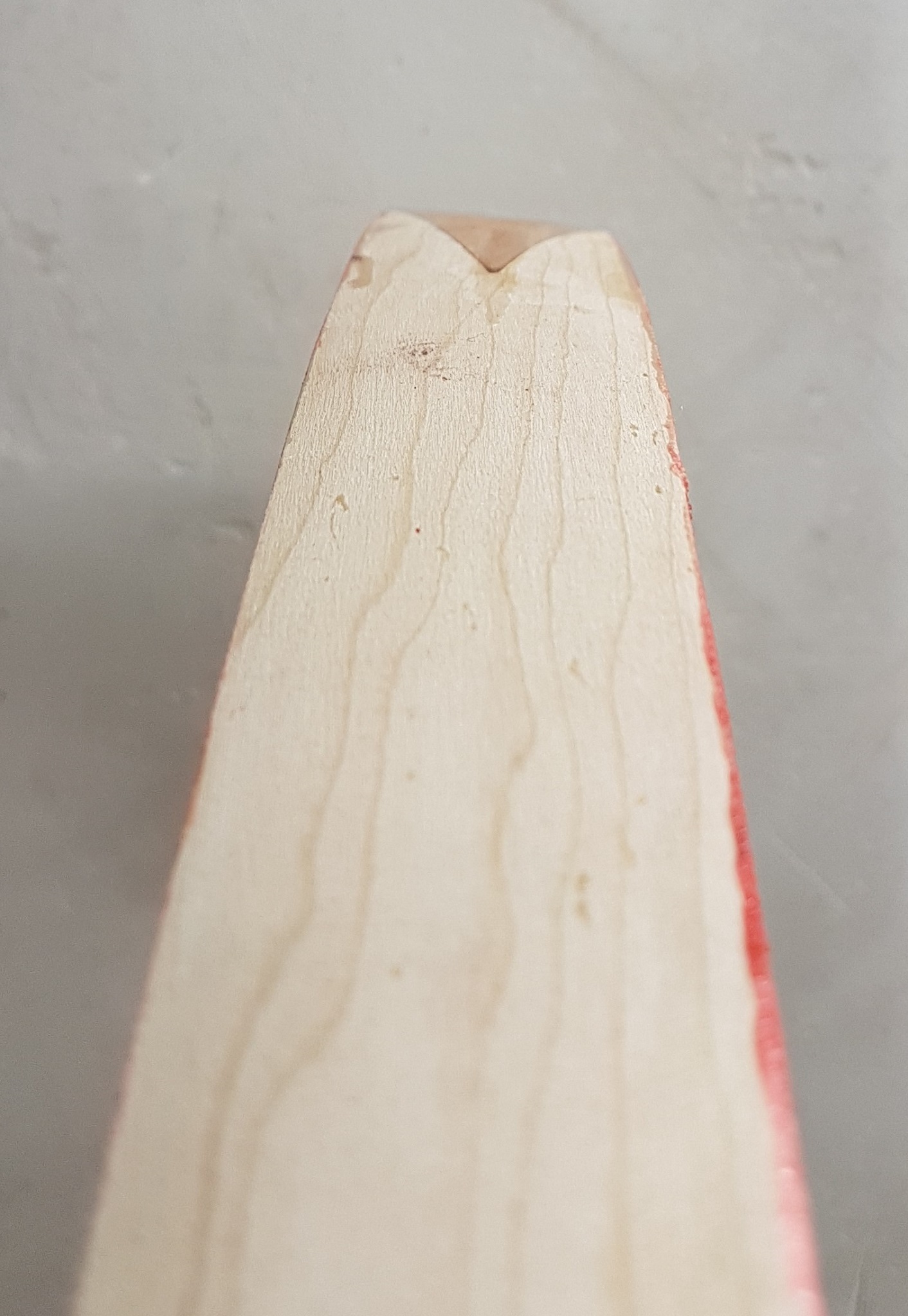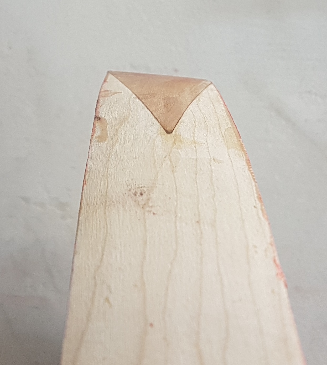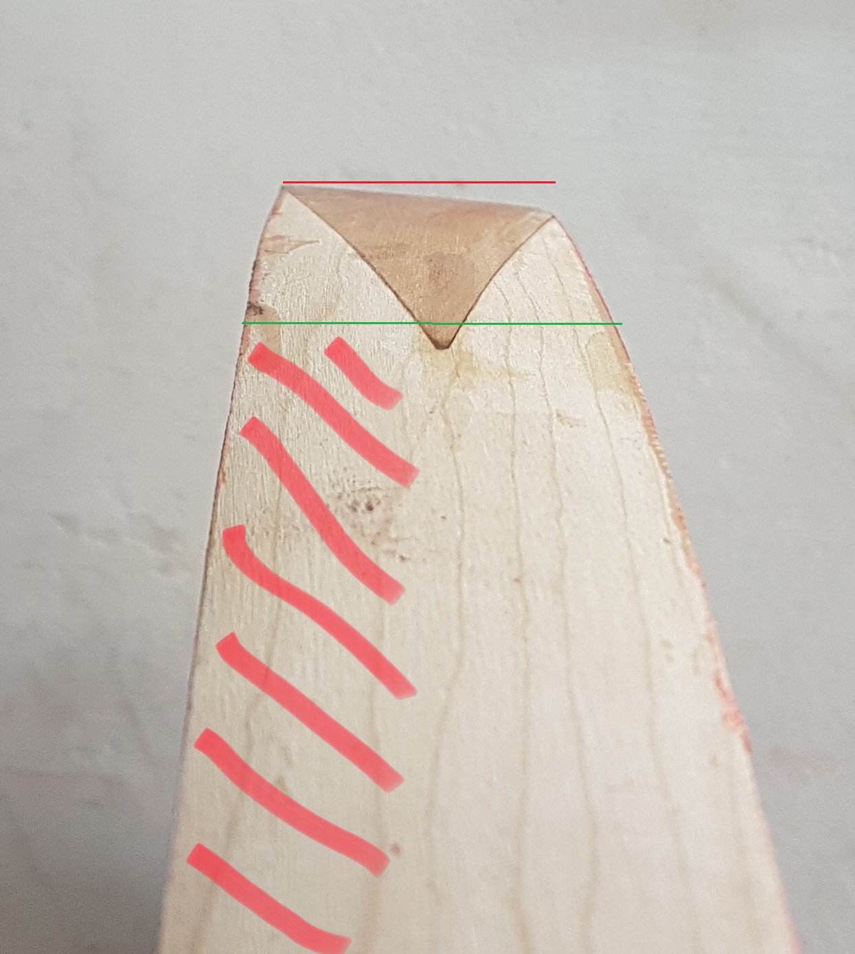 Da stellt sich jetzt die Frage ob ich zuerst korrigieren soll oder versuchen soll mit dem Horn zu korrigieren. Nur muss ich ja noch die Bauchseite gleichmäßig runden und mit dem Gegenstück Ziehklinge das Horn anpassen. Das ist aber in dem Zustand eigentlich nicht möglich, denn mach ich das jetzt verändere ich die Dicke des Kerns ungleichmäßig. Also tendiere ich dazu zuerst zu korrigieren - wie wären denn da die Meinungen?
