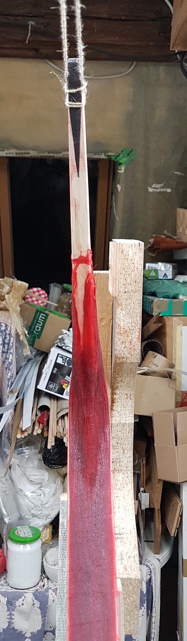 Leider hat sich der seitliche Verzug des Bogens doch nicht korrigieren lassen - da unterlag ich einer Täuschung. Die zusätzlich aufgebrachten Sehnen habe ich wieder runter gefeilt. Dann hatte ich geprüft, wo der Fehler liegt und tatsächlich ist es so, dass die Sehnen sich wohl auf einer Seite etwas stärker zusammen gezogen haben