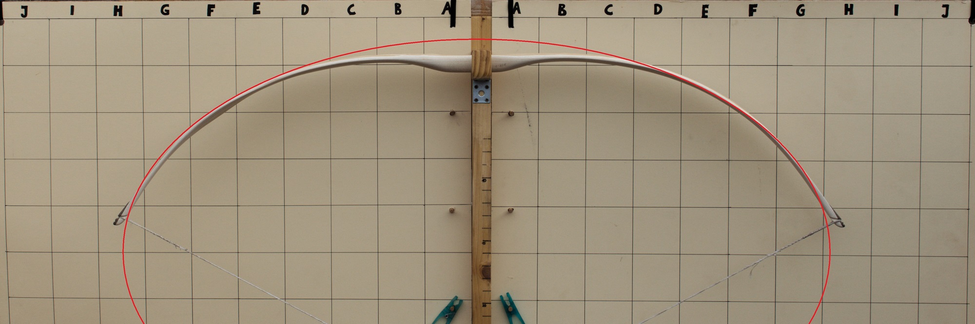 also der linke Wurfarm ist viel zu stark( ich denke das ist der untere) und somit wird der rechte zu stark in die Mittenbiegung gedrückt. Das sieht man dran, das der Bogen schief auf dem Tillerstock liegt. Jetzt aber mal eine Frage... ist der ober Wurfarm ca.2,5cm länger als der untere? Ich weiß nicht warum ihr das alle macht...als Anfänger ist es leichter, wenn beide Wurfarme gleich lang sind. Man lässt den unteren Wurfarm leicht stärker oder kürzt ihn zum Schluss um ca 1cm... das reicht völlig 2. Wenn du schon ein Brett mit Linien hinter den Bogen hängst, dann sollten diese auch auf einer Linie liegen(siehe Foto), sonst irritiert das mehr als es hilft ;) Dir war der Bogen sowieso zu stark oder?