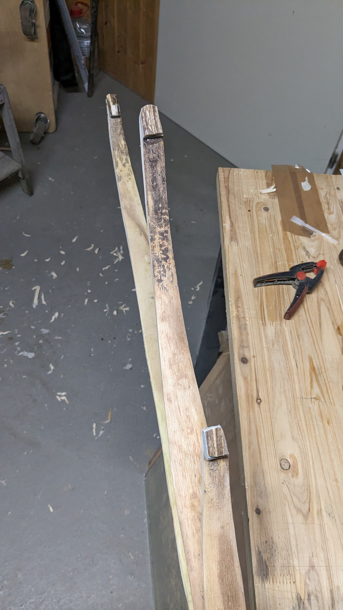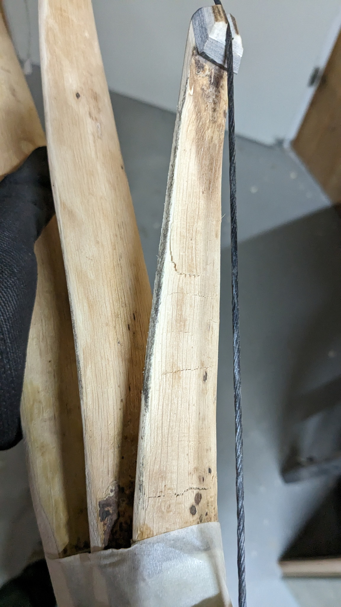 Jetzt muss ich mich schnell entscheiden, ob ich einfach weiter schwäche oder ob ich den mittleren Bogen etwas kürze, den recurve reduziere und somit das Kabel näher an den Rücken holen. Vielleicht ist meine Theorie aber auch falsch und durch das kürzen mache ich den mittleren Bogen und damit das Gesamtkonstrukt, nur stärker