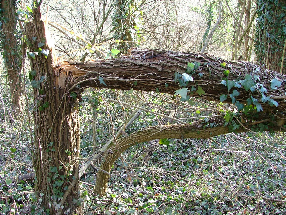Beim Suchen hab ich diesen Holler entdeckt, auf dem wie man sieht ein Baum gestürzt ist. Trotz des dezenten Balastes ist er nicht gebrochen. Also scheint der Holler in dem Waldstück extrem elastisch zu sein. Das hat mich auf eine Idee gebracht.
