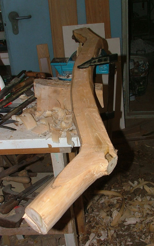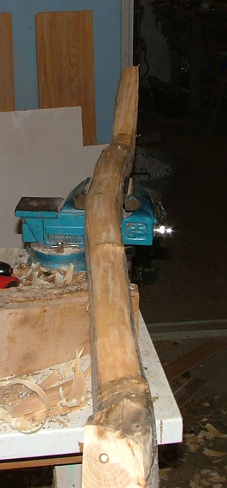 Als erstes habe ich die Wurfarmbreite durchgehend mit 5cm eingezeichnet. Natürlich dem Verlauf des Stammes folgend, daraus ergibt sich ein seitlicher Knick im Griff der später korrigiert wird. Und dann bab ich mit dem Zugschwert ( ;D ) meines Vaters losgelegt.