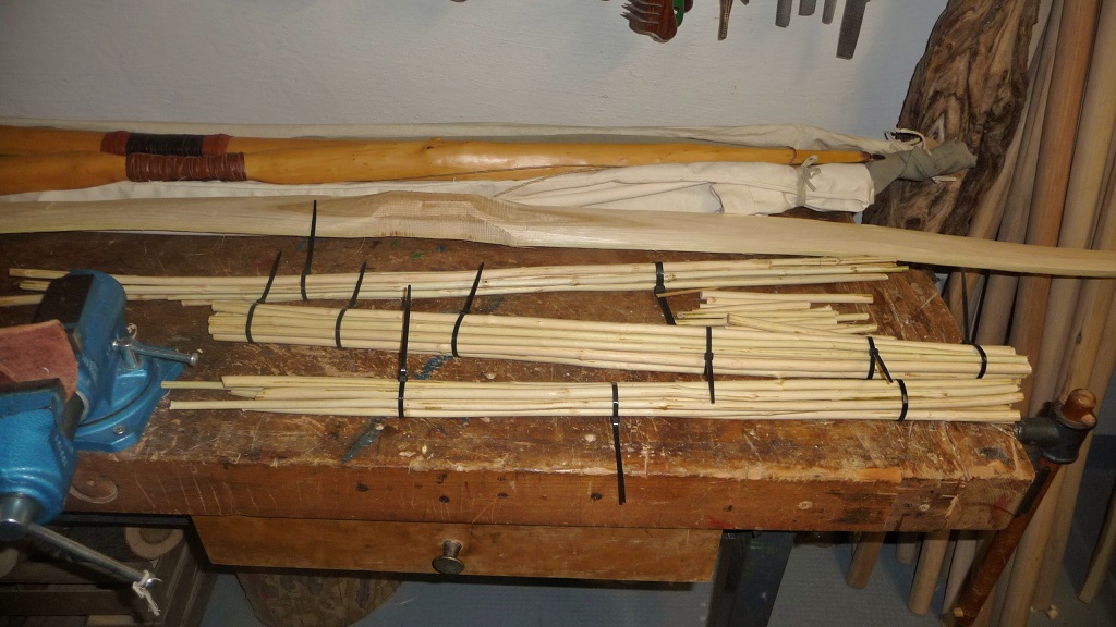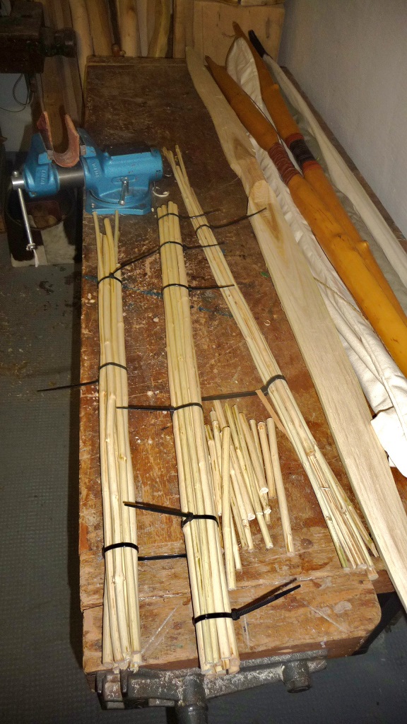 mit 29 Rohschäften habe ich begonnen, 11 haben den harten Ausleseprozess überstanden, sind inzwischen entrindet, gerichtet(so gut wie ich es hingekriegt habe), getrocknet, haben einen breasted Taper(Holler ist dafür übrigens definitiv nicht geeignet, wollte es aber auf die harte Tour rausfinden) erhalten und wiegen jetzt von 385-490gn, Spinewerte liegen zwischen 40/80#, kriegen jetzt noch 3 x Leinölfirnis, und dann werden ganz normale Pfeile für den 3D-Parcours gemacht, bin gespannt wie die sich dann so schlagen in der Parcours-Realität.