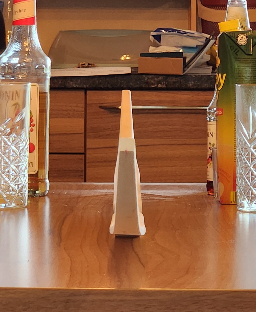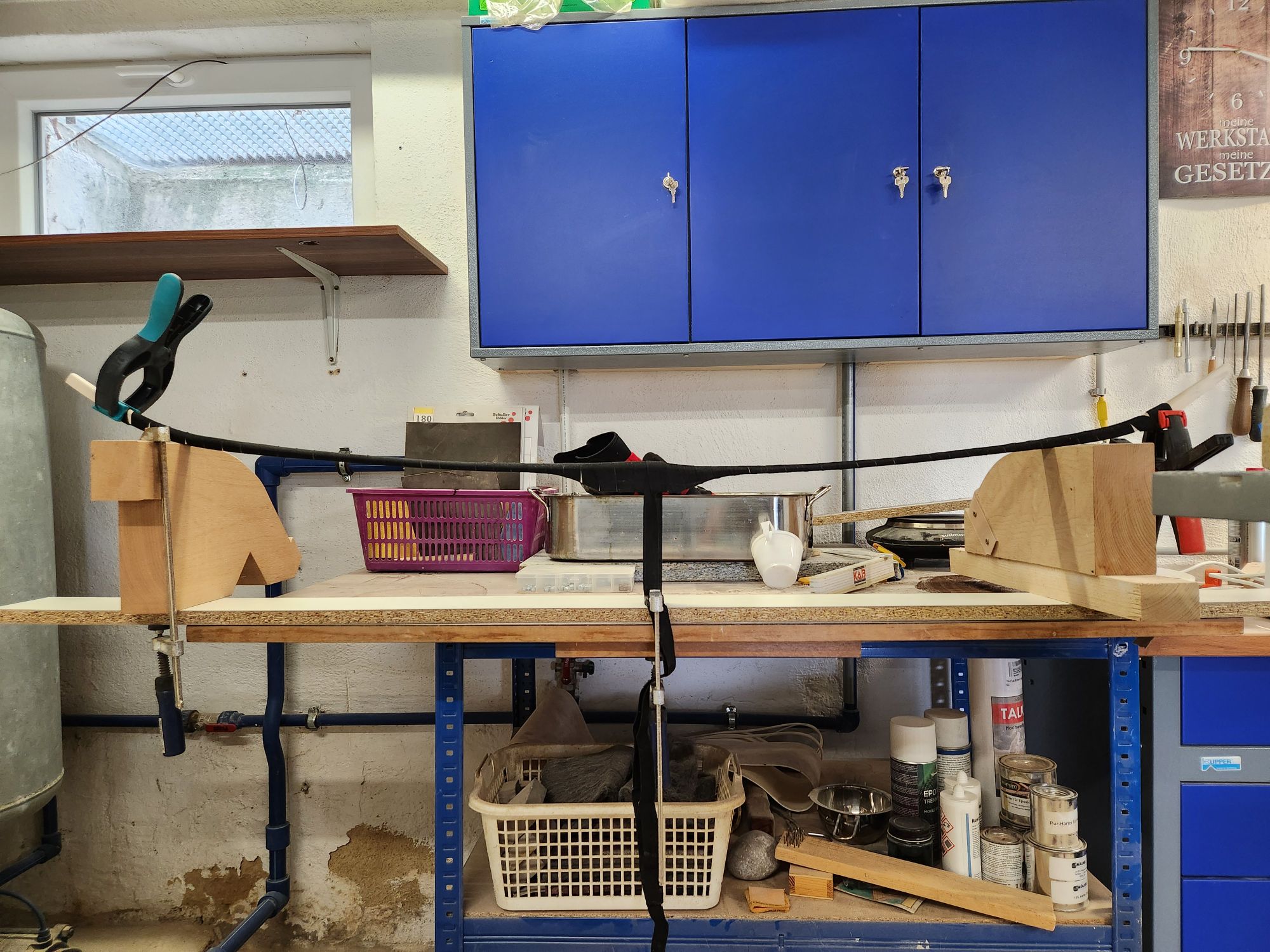 Ich hatte jetzt noch einige Zeit damit zu kämpfen dass der Bogen mit Schnur zwar gerade aussah, aber mit freiem Auge nicht. Ich hab dann festgestellt dass man das am besten auf einem Foto sichtbar machen kann, indem man von weit weg mit 10x Zoom die beiden Recurves in eine Linie stellt. So sieht man dass der Wurfarm links und rechts unterschiedlich weit über die Recurves übersteht.