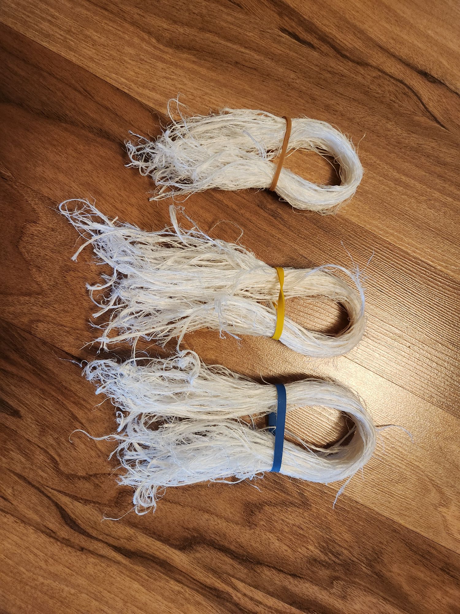 Währenddessen hab ich die Sehnenbündel noch gekämmt und nach Länge sortiert. Von der Sehnenmenge her hab ich mich nach Neumis Angaben orientiert. 2 Bündel mit 40cm Länge und je 9g schwer und 1 Bündel mit 30cm und 6g.