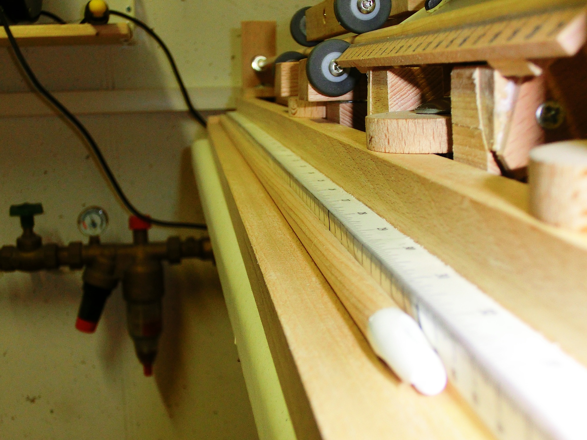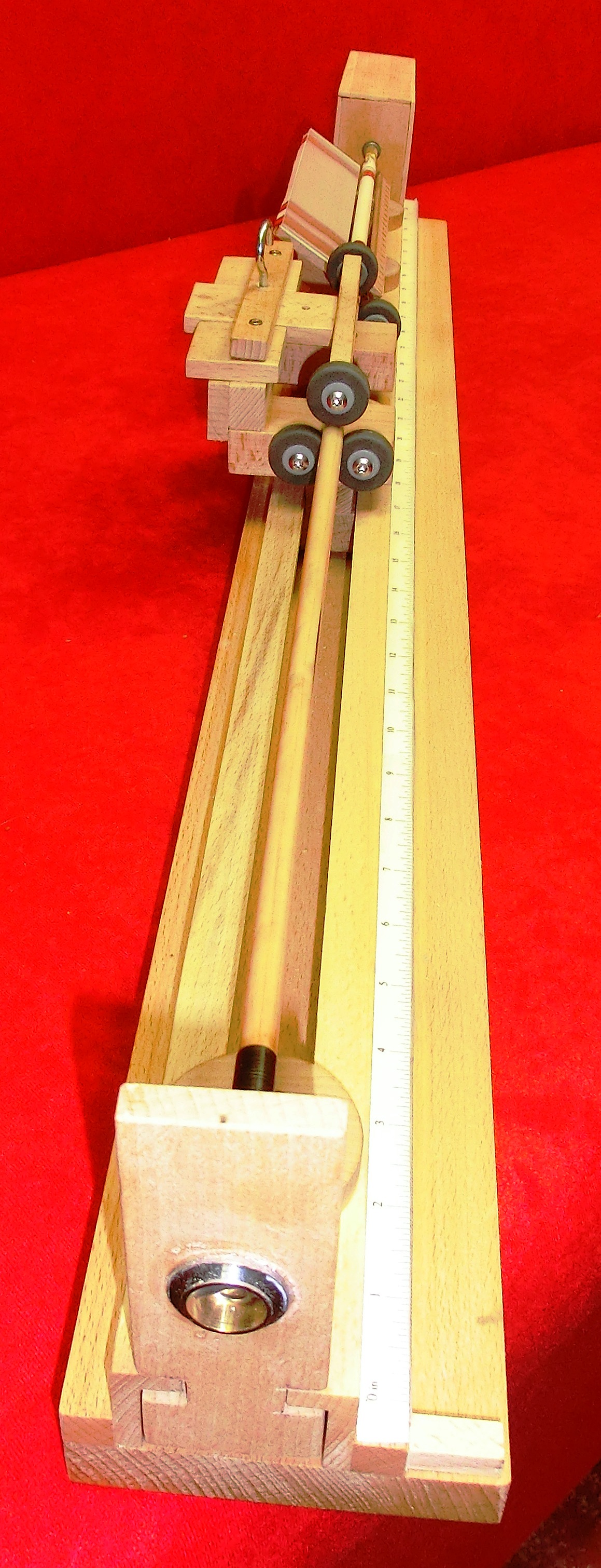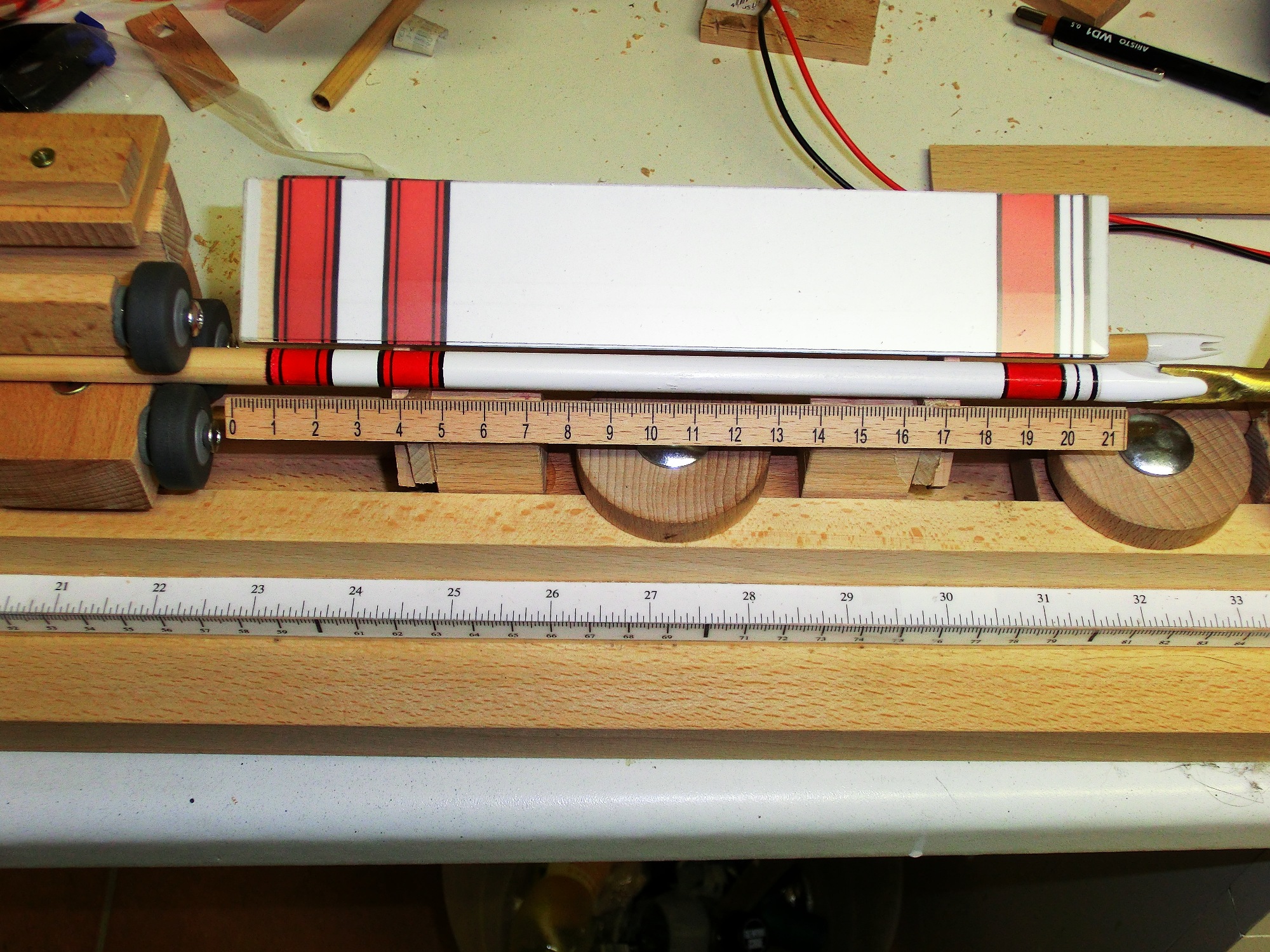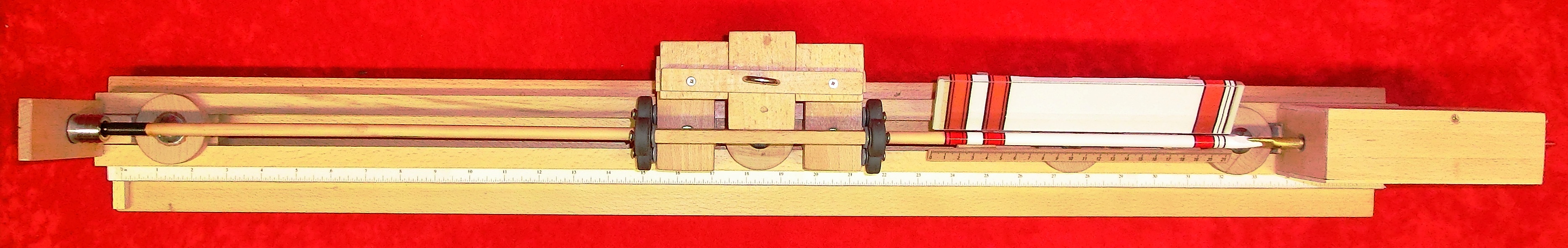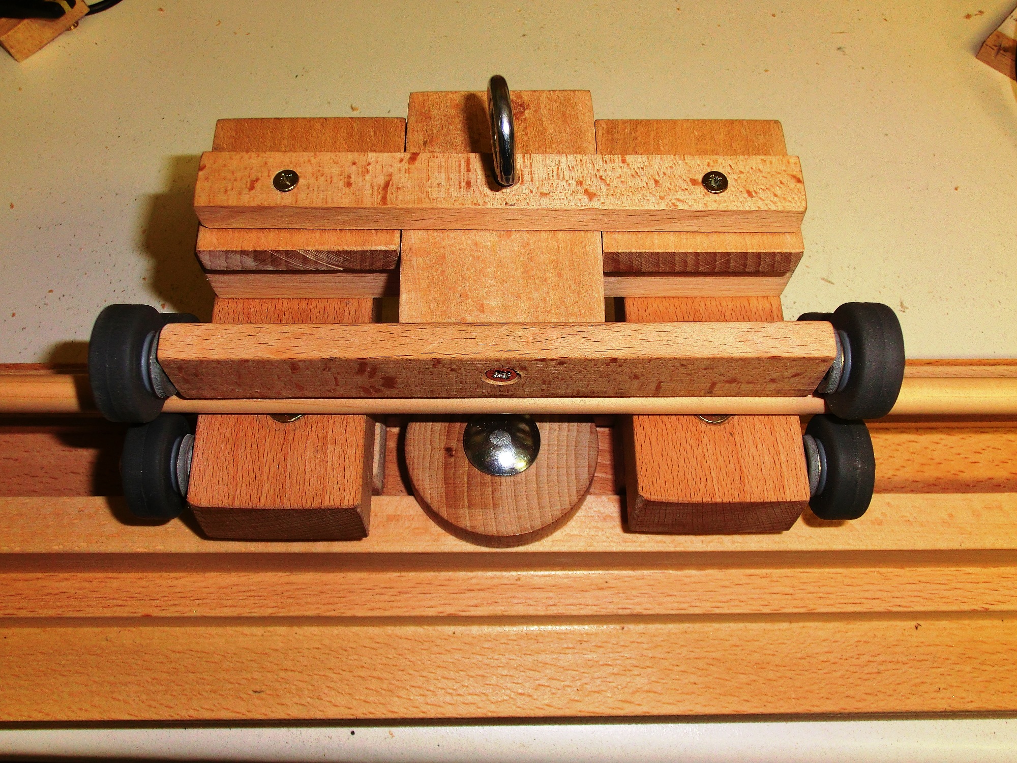 Im Mittelteil ist eine kleine Änderung nötig. Durch die versetzten Rollen reicht schon ein kleiner Druck, damit sich der Schaft biegt. Daher habe ich die Anordnung der oberen Rollen geändert.