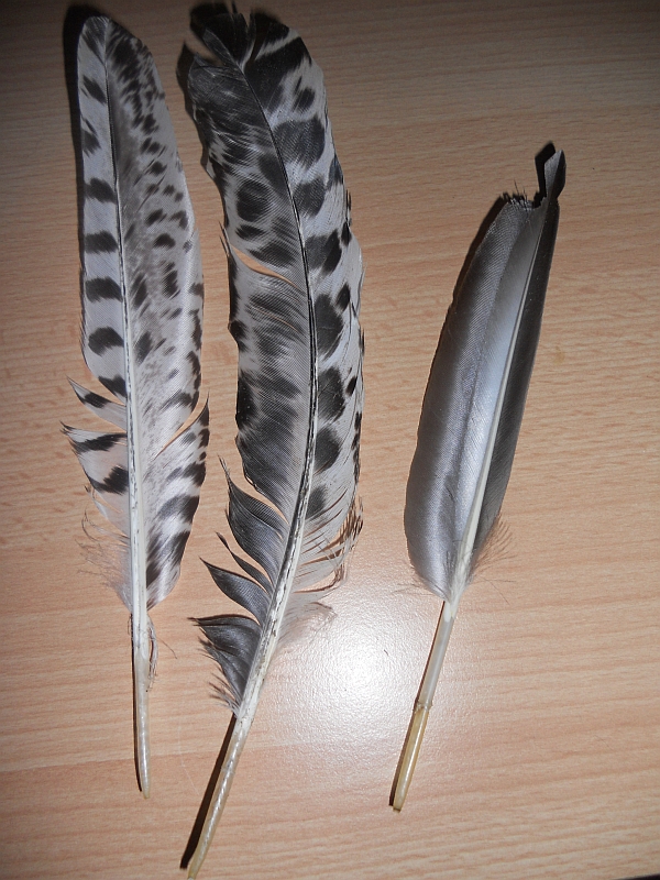 Hab noch einige Hühnerfedern da. Die will ich auf jeden Fall noch verarbeiten. Die Schwanzfeder sind ziemlich fest und sollten sich durchaus eignen. Die Schlagfedern sind ziemlich weich. Mal sehen, wie ich Lust und Zeit hab.