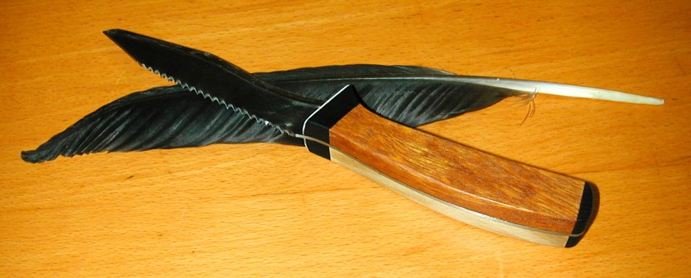 Ich hab es bis jetzt noch nie nachgeschärft. Stattdessen hab ich versucht das Ding möglichst an die Grenzen zu bringen (Pfeilspitzen aus einer Wurzel raushebeln, am besten wenn die Wurzel noch unter der Erde liegt) - das einzige was passiert ist sind ein paar Scharten von den Steinen ganz vorne an der Klingenspitze und einmal ist mir der Messergriff abgeplatzt, der hat die drehende Bewegung nicht ausgehalten. Jetzt ist der Griff verschraubt.